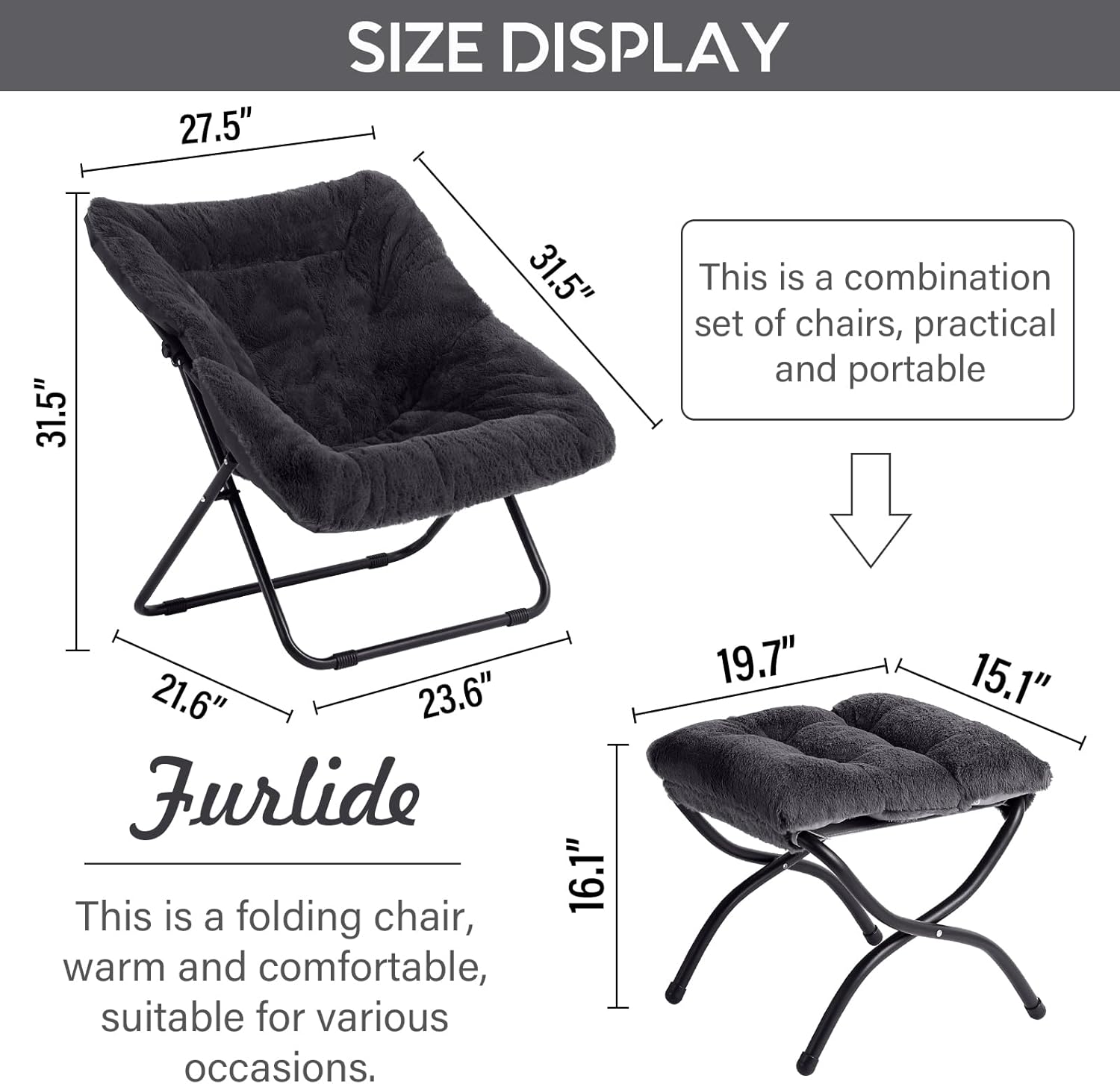 Oversized Folding Faux Fur Chair with Ottoman, X-Large Soft Saucer Chair, Foldable Metal Frame for Bedroom, Living Room, Balcony (Black)
