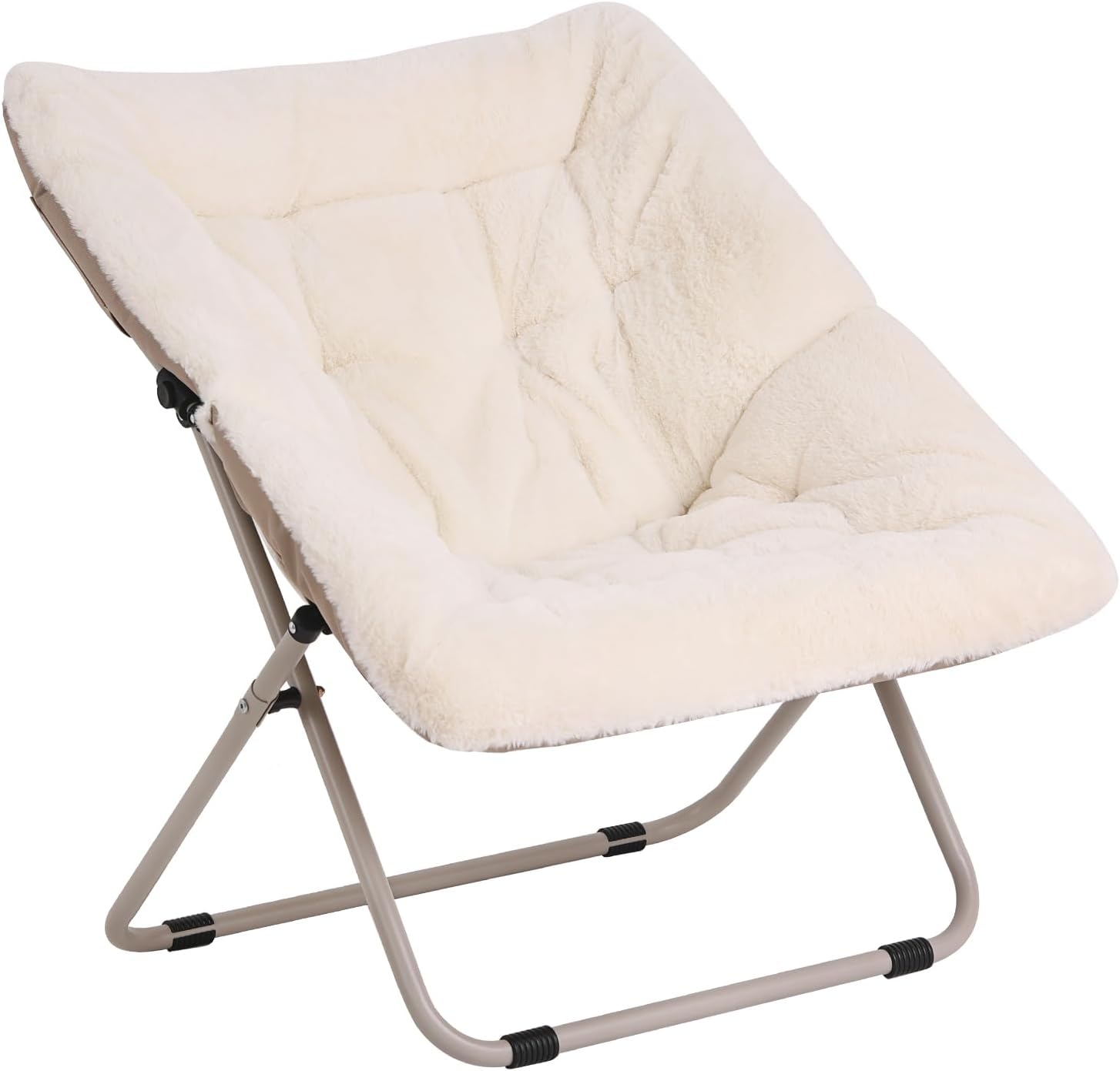 Saucer Chair, Comfy Bedroom Chairs, Oversized Folding Faux Fur Chair, Foldable Metal Frame Chair for Living Room, Balcony, Patio, Study, Playroom (Beige)
