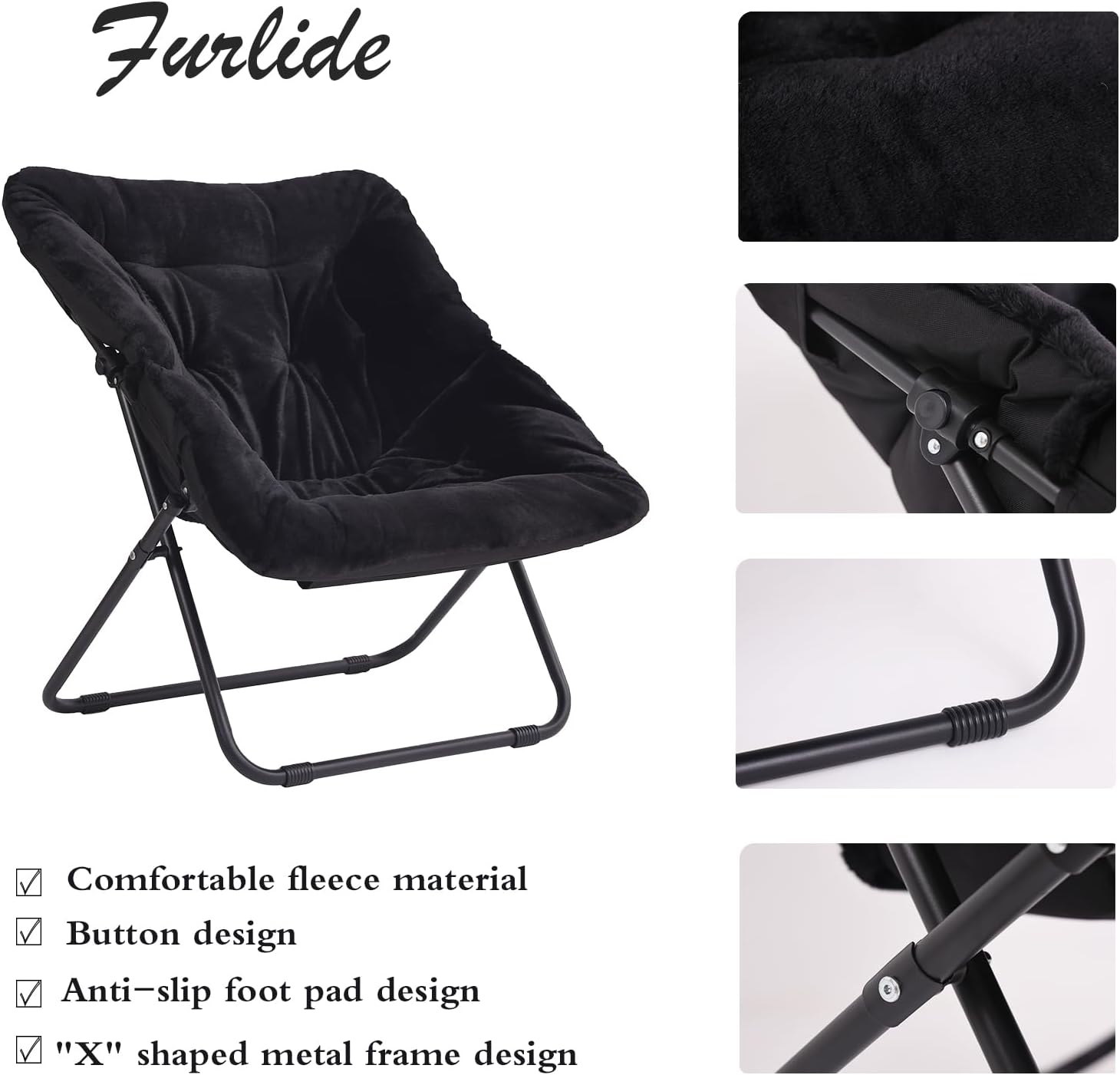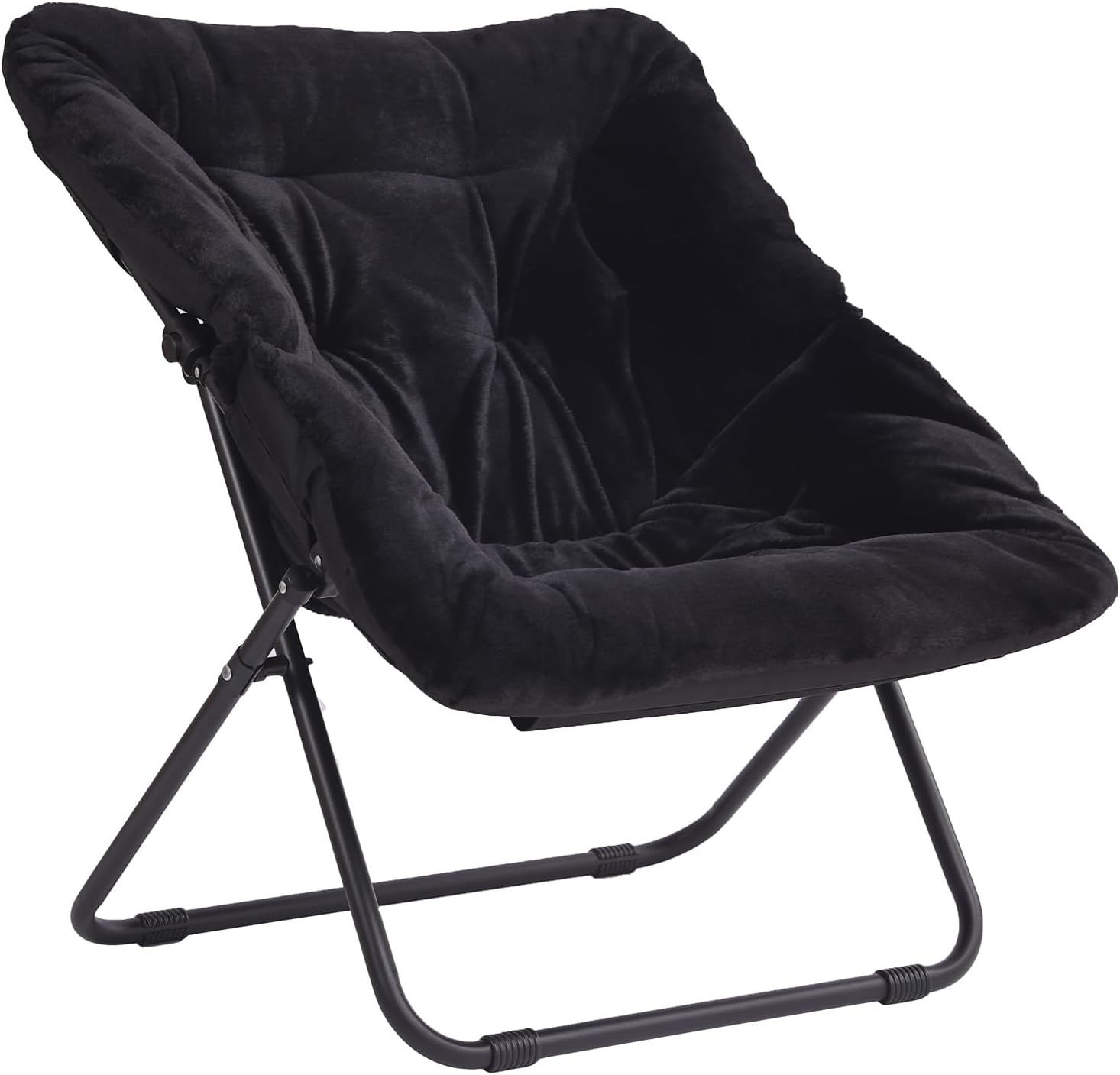 Saucer Chair, Comfy Bedroom Chairs, Oversized Folding Faux Fur Chair, Foldable Metal Frame Chair for Bedroom, Patio, Study, Playroom (Black)