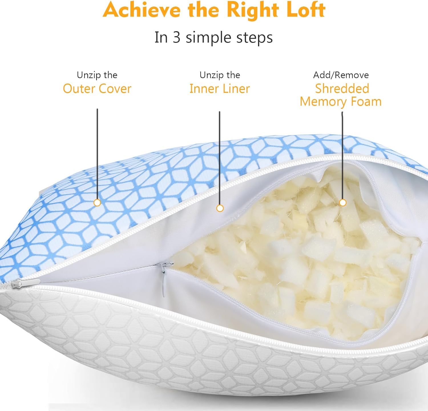Bed Pillow Queen Size 1 Pack, Shredded Memory Foam Pillow Adjustable,Cooling Pillow Soft and Supportive for Side Back Stomach Sleepers