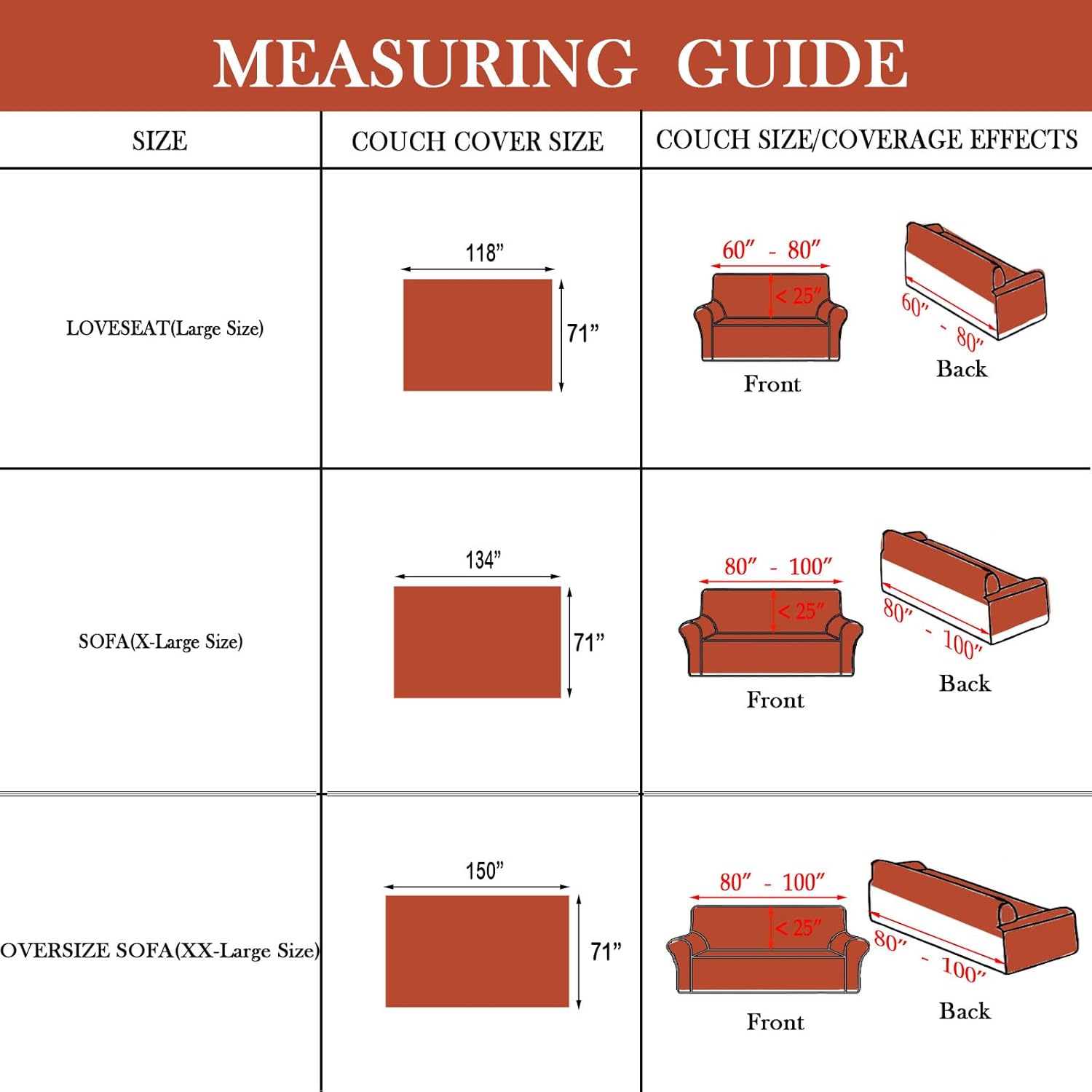 - ๐งกHOW TO CHOOSE: Please measure your furniture before you buy. We recommend Large Size 71"x 118 " for loveseat; X-Large Size 71" x 134" for sofas; XX-Large Size 71" x 150" for oversize sofas; Suitable for most couch, Provide perfect coverage for the sofa (including armrests)