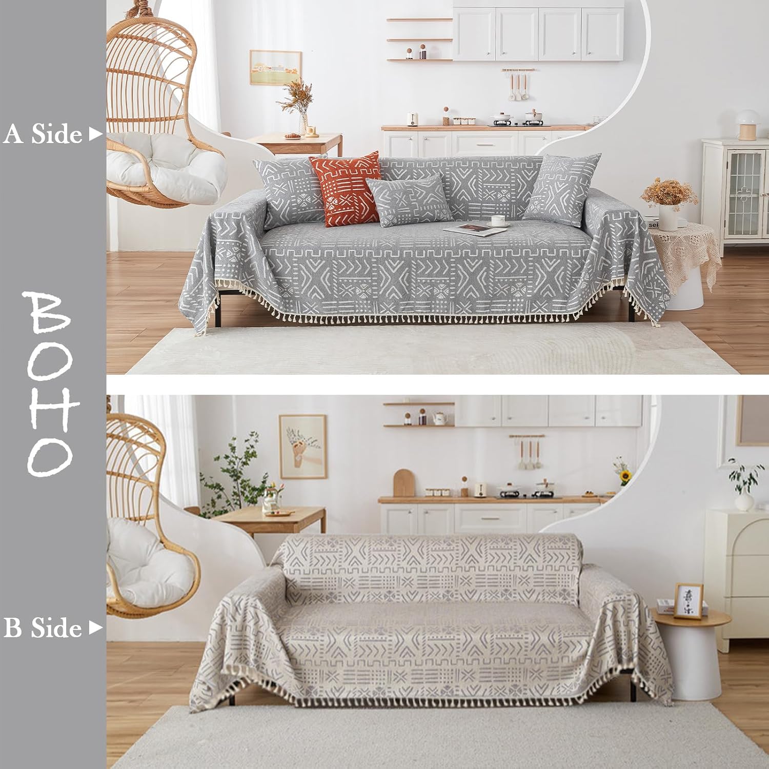 HANDONTIME Bohemian Grey and White Couch Cover for Dogs Aztec Tribal Sofa Covers 3 Cushion Aesthetic Tassel Slipcover Seat Universal Loverseat Futon Cover, 71/'' X118/'', Tassel 2:grey/White