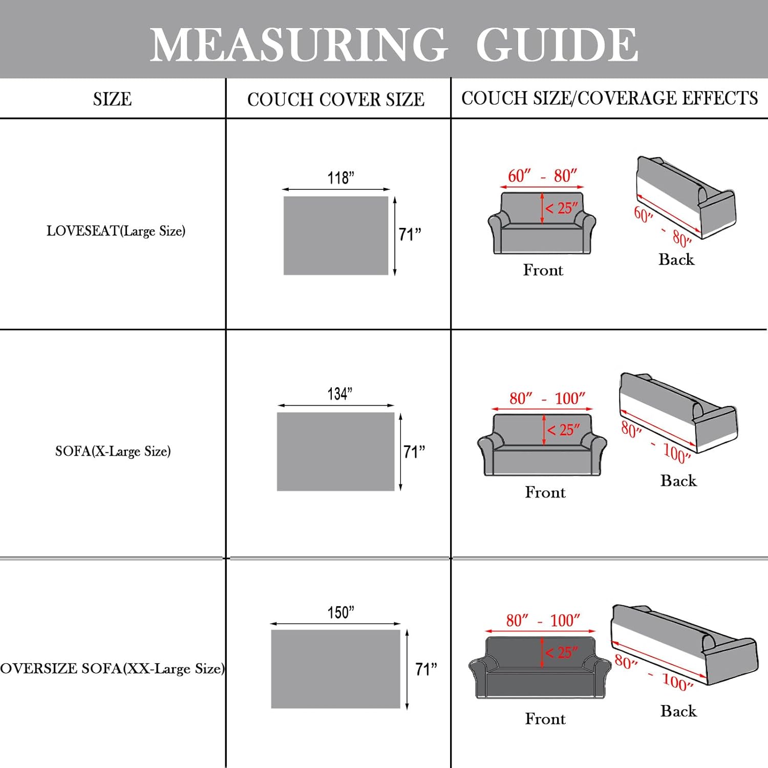 - ๐๐๐ ๐๐ ๐๐๐๐๐๐ : Please measure your furniture before you buy. We recommend Large Size 71"x 118 " for loveseat; X-Large Size 71" x 134" for sofas; XX-Large Size 71" x 150" for oversize sofas; Suitable for most couch, Provide perfect coverage for the sofa (including armrests)