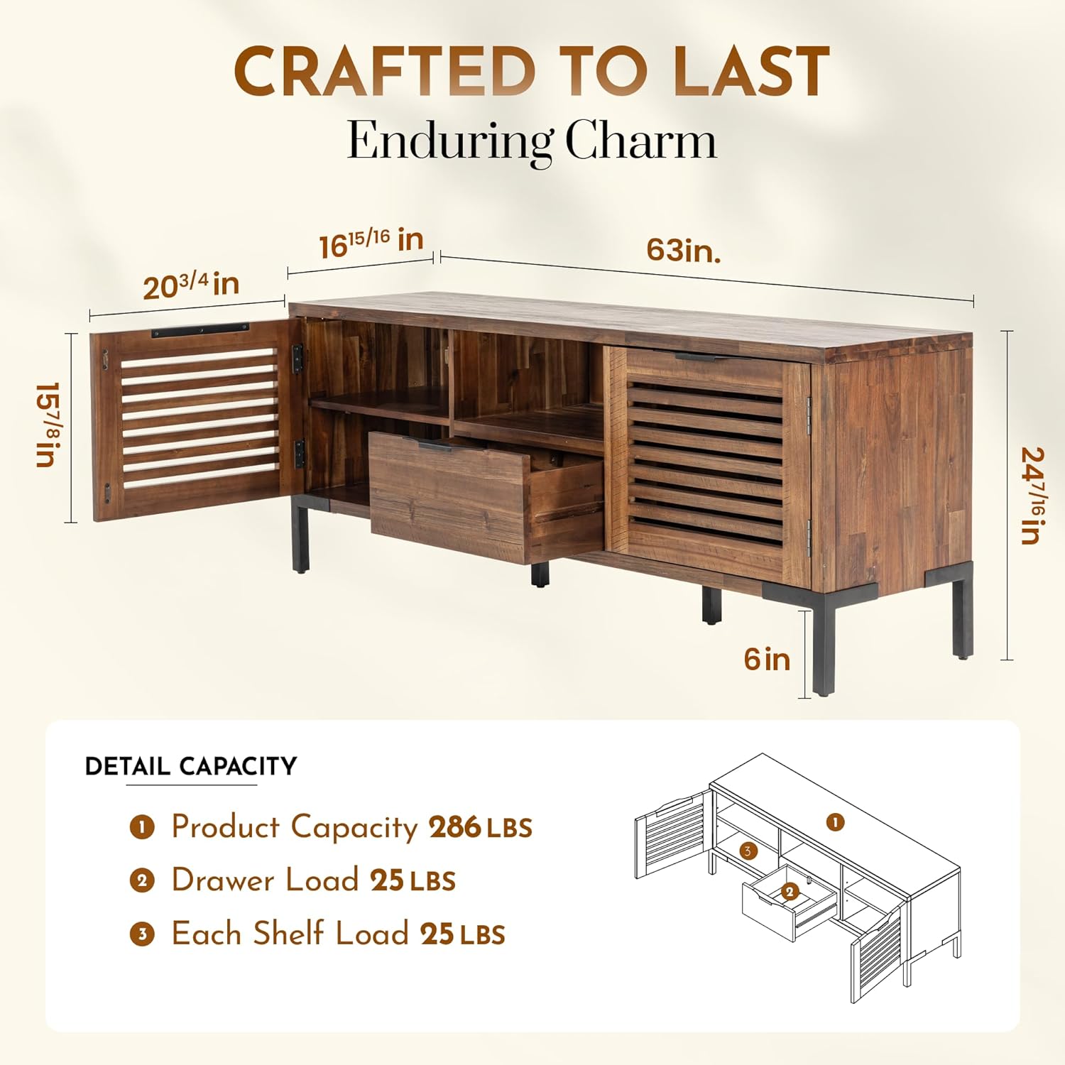 - PREMIUM MATERIALS: Our media console is superbly crafted from 100% solid acacia wood and protected by a 5-layer coating; With sturdy metal legs & adjustable levelers, our TV console table offers a high capacity and ensures stability on any surface