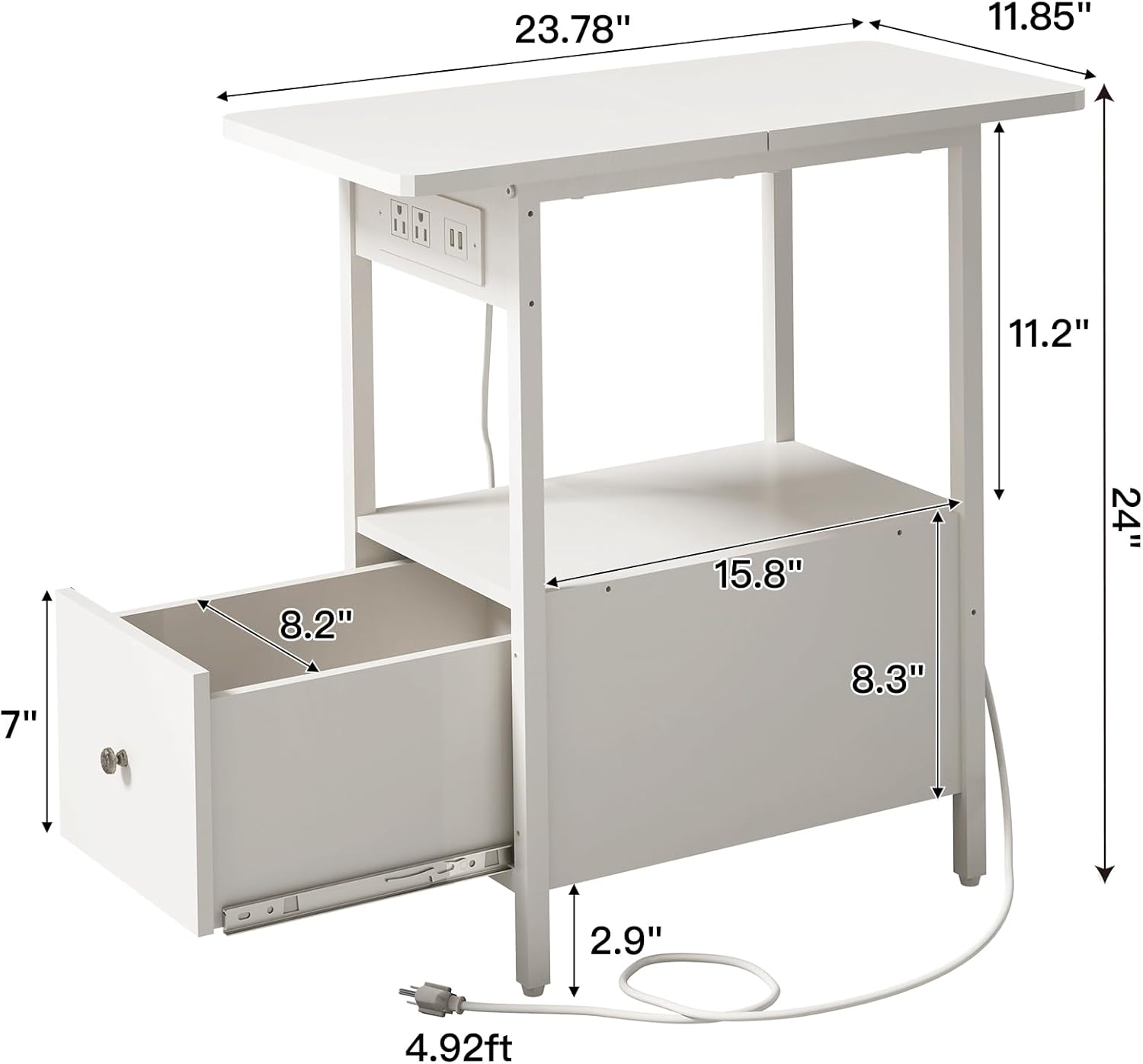 LIDYUK End Table with Charging Station, Narrow Side Table with Drawer and USB Ports & Power Outlets, Nightstand Bedside Tables for Small Spaces, Bedroom, Living Room, White
