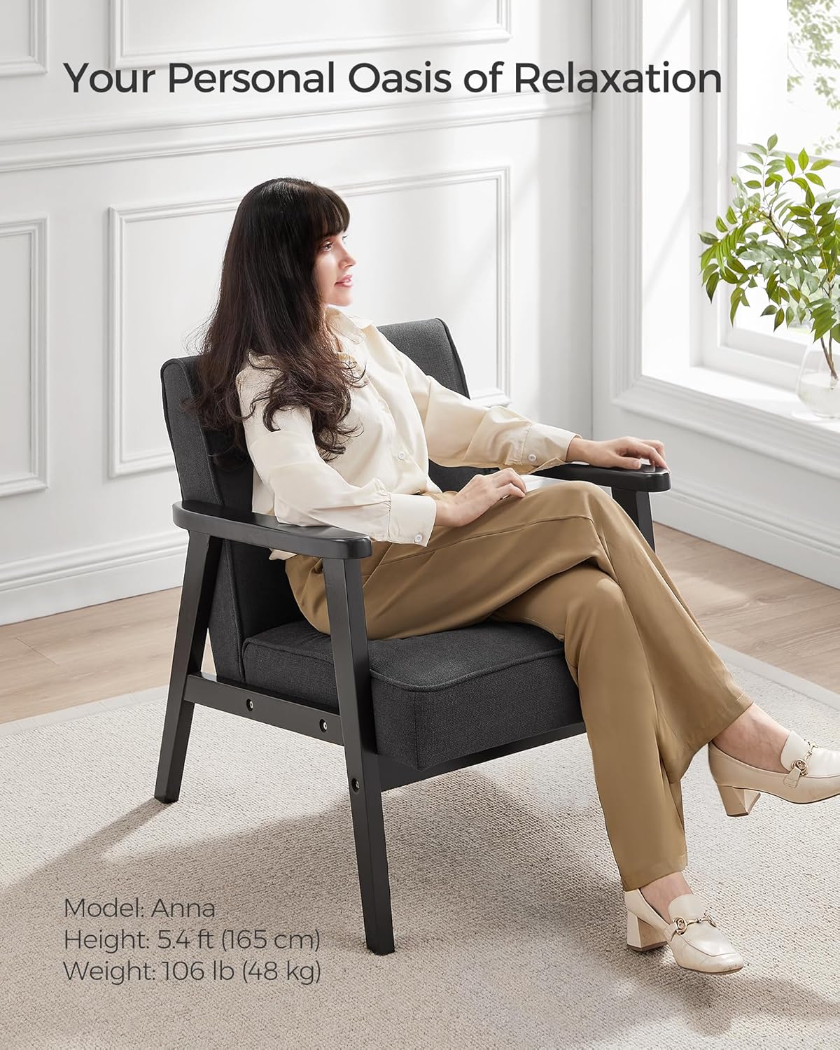 SONGMICS Accent Leisure Chair, Mid-Century Modern Arm Chair with Solid Wood Armrests and Legs, 1-Seat Cushioned Sofa for Living Room Bedroom Balcony Studio, Classic Black ULAC001B01