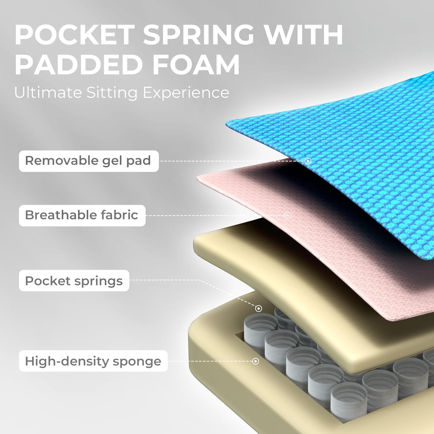 - Individually Pocket Springs: The seat cushion features pocket springs, a technique commonly used in sofas. Each spring operates independently, conforming to pressure and body weight to deliver resilient support and a luxurious comfort experience comparable to high-end gaming chairs.