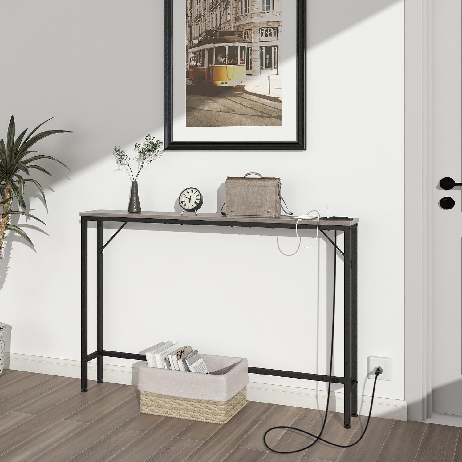 Tohomeor 5.9" Skinny Behind Sofa Console Table with Charging Station 47.2" Narrow Long Behind Couch Table with Power Outlets USB Ports Thin Entry Table for Entryway Living Room Hallway Retro Grey