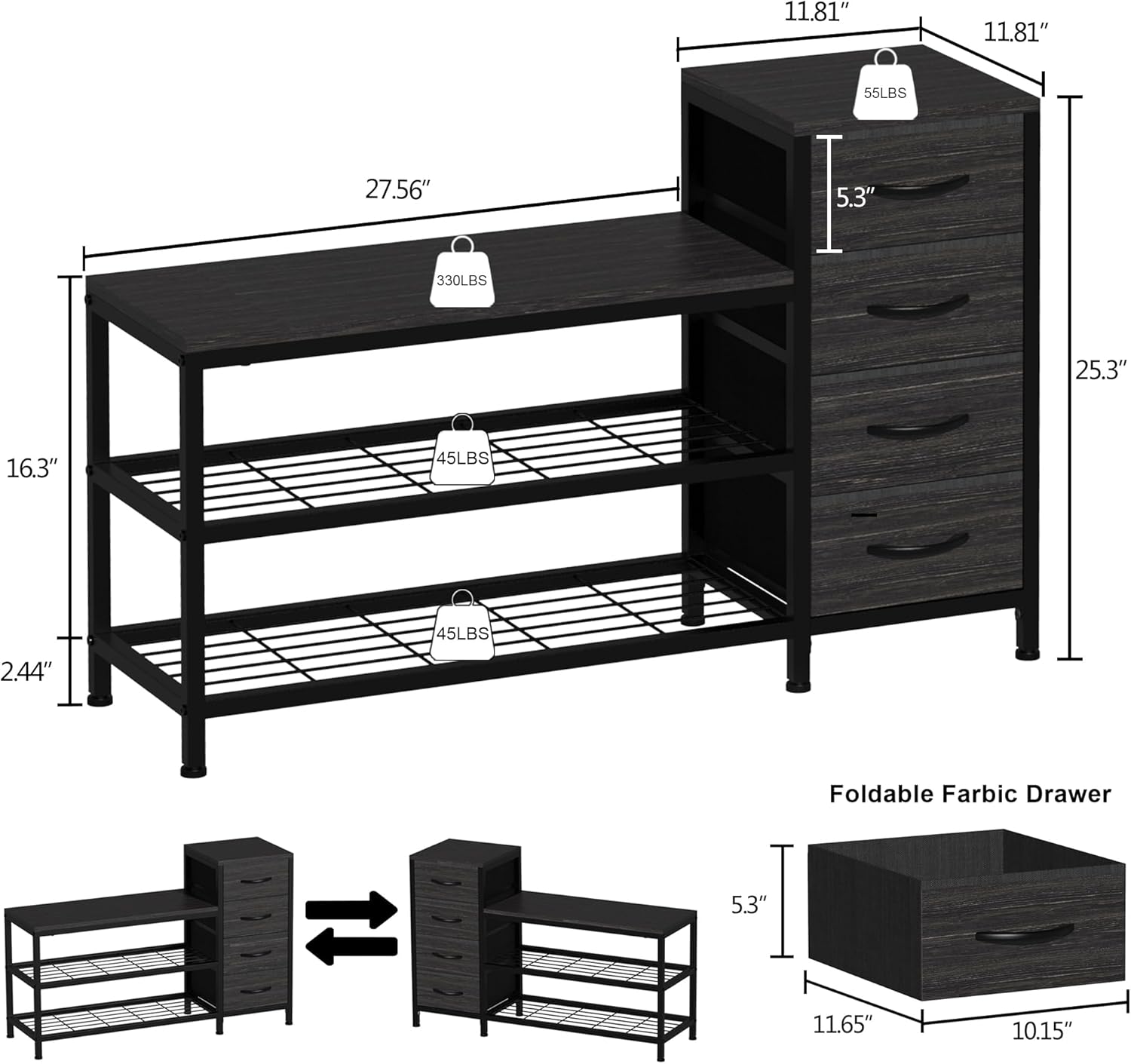 - Large Capacity Entryway Bench: L-39.37in x W-11.81in x H-25.3in, 3 tier shoe rack bench, could store 6-8 pairs of shoes. Constructed from metal frame and MDF board, can hold up to 400lbs and will not wobble or squeaky while sitting on it