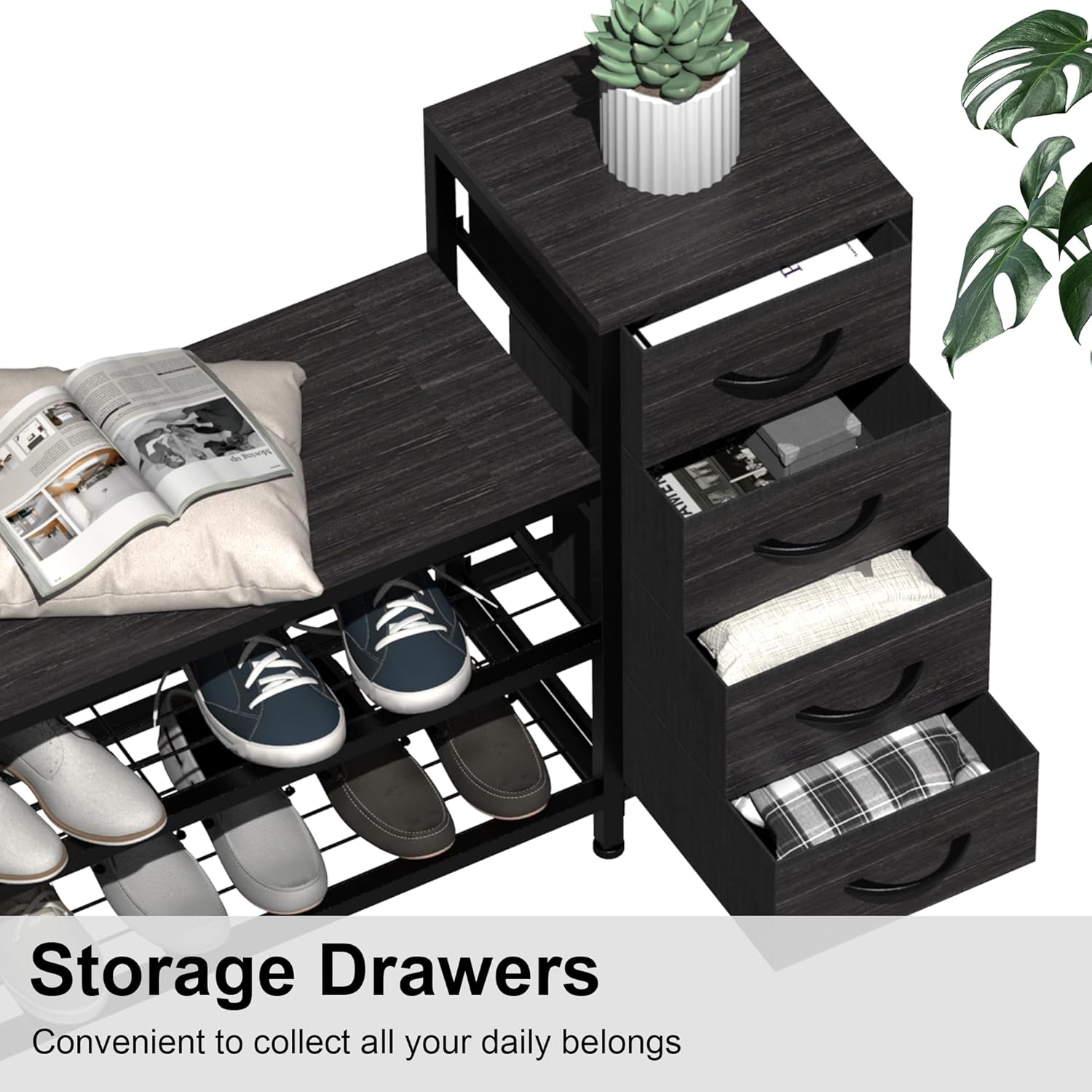 EXOTICA 3 Tier Entryway Bench Shoe Storage Bench with 4 Fabric Drawers Metal Frame and Wooden Board Shoe Rack Bench with Seat for Entryway Hallway Front Door Doorway