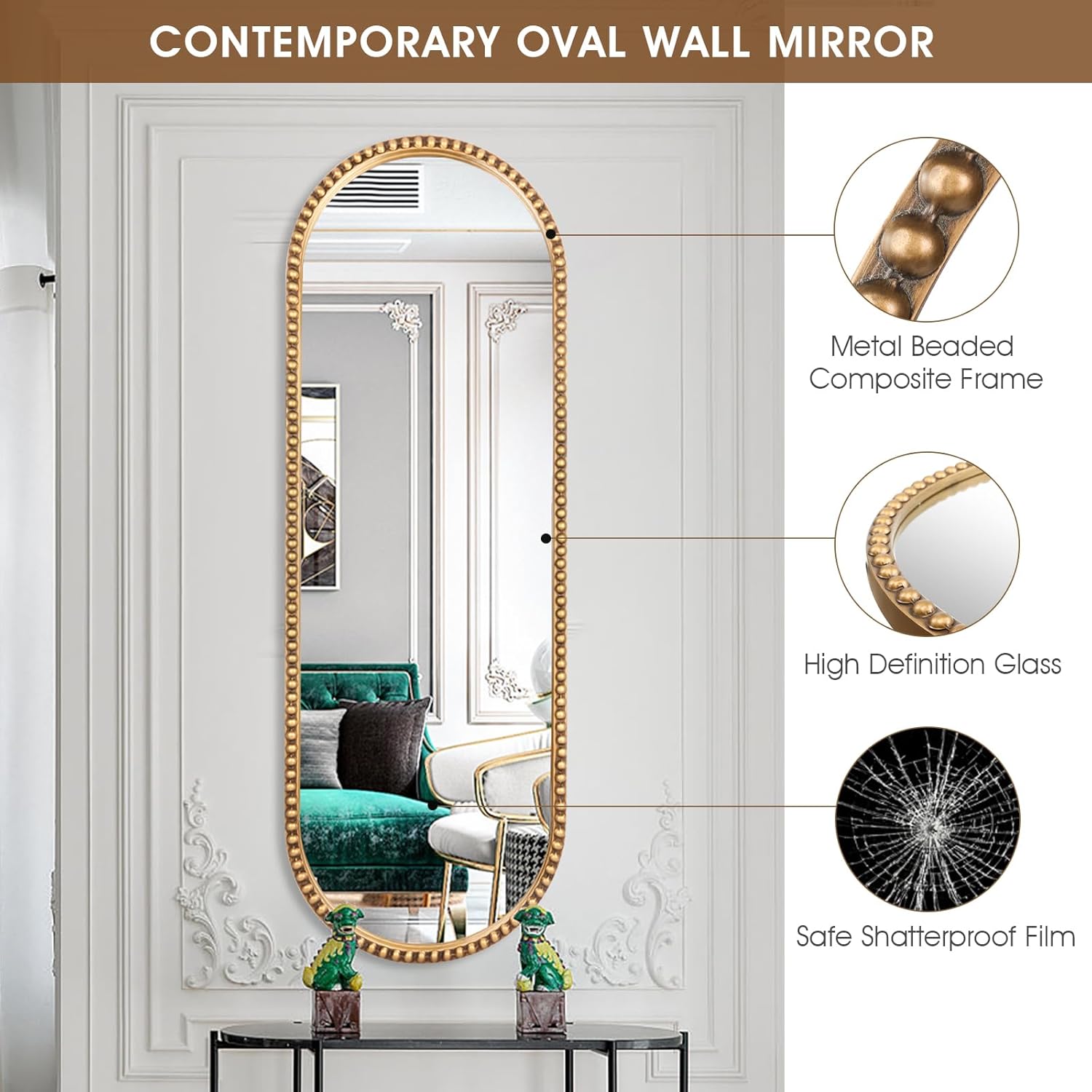 Oval Full Length Mirror, 16"x47" Metal Beaded Frame Large Hanging Dressing Floor Mirror for Bedroom, Living Room, Entryway, Antique Gold (No Stand)