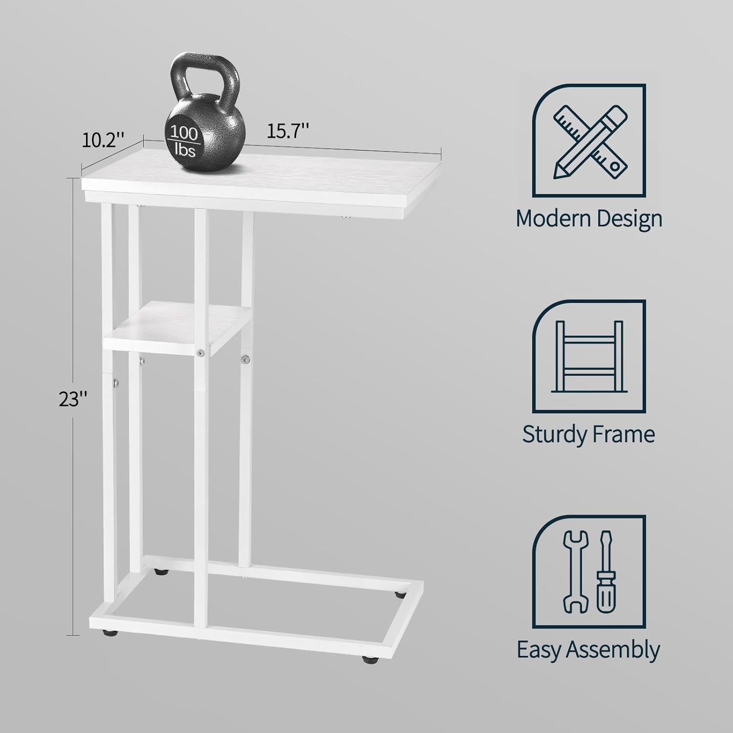 - C Shaped Design: The C table is easy to slide into the underside of the couch, bed or chair, allowing you to conveniently use it without getting up. Meanwhile, the compact C-shaped design also makes it a perfect small end table for small spaces. Ergonomic 24” height offers you a comfortable experience for working from home.