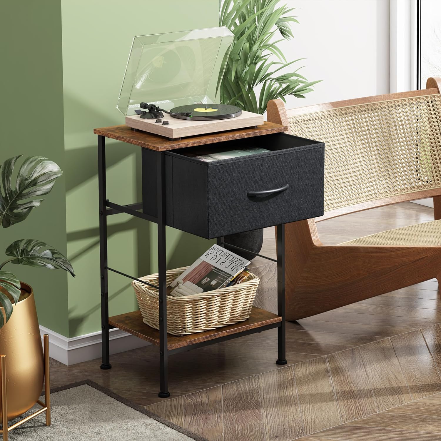 WLIVE Nightstand Set of 2, End Table with Fabric Storage Drawer and Open Wood Shelf, Bedside Furniture with Steel Frame, Side Table for Bedroom, Dorm, Black and Rustic Brown, 25.03" Height