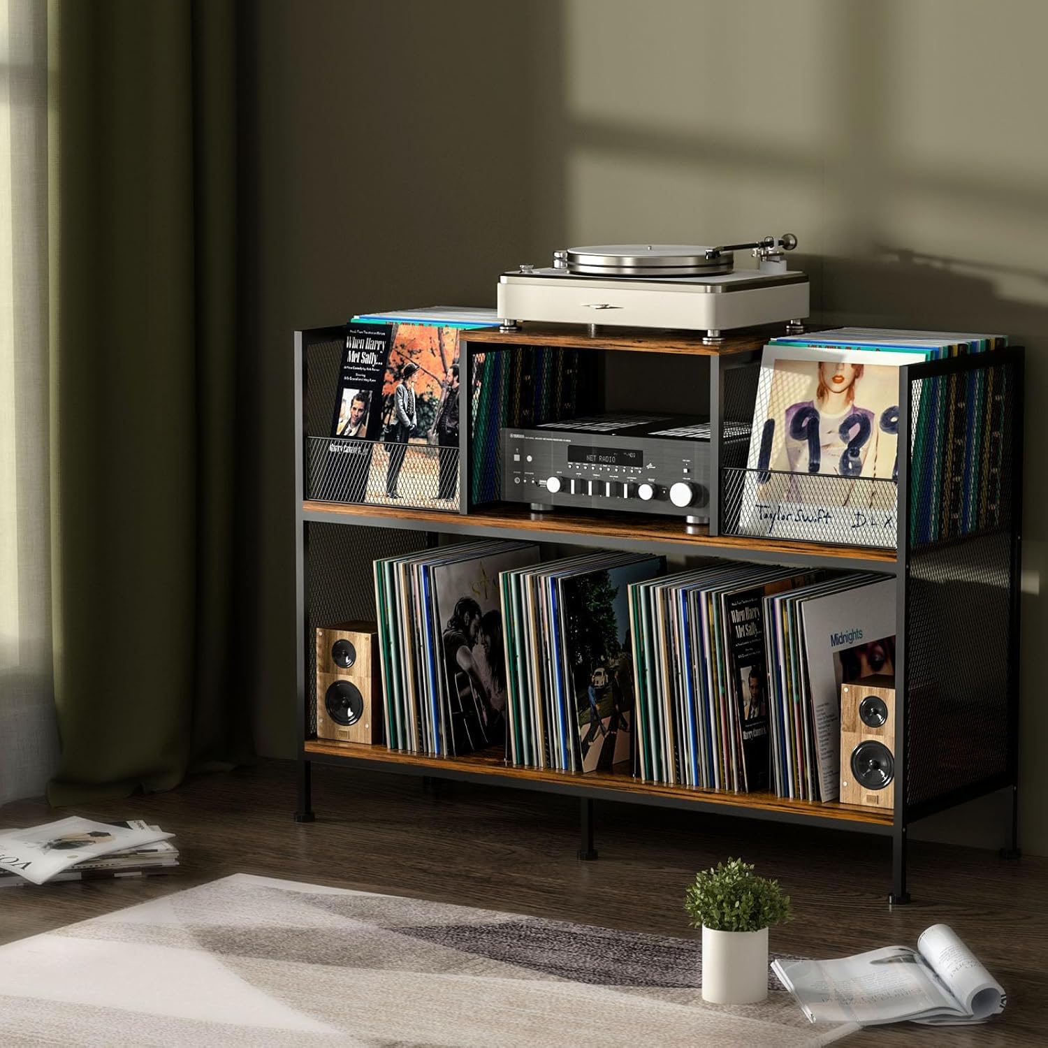 - Sturdy and beautiful: The vinyl record storage stand is designed with brown-grain particle board and solid iron tubing for durability and ease of cleaning and to ensure the stand's stability and longevity. The mid-century style design adds a unique charm to display your precious vinyl collection and adds an artistic ambiance to your music corner.