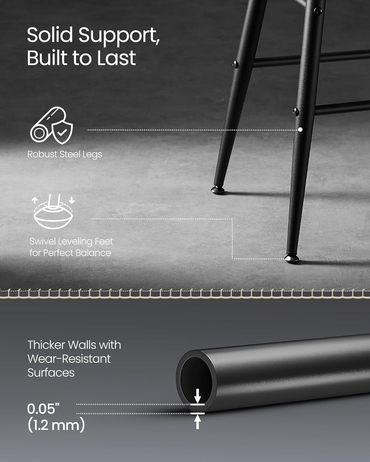 - [Steadfast Stability, Gentle on Floors] With splayed metal legs forming a rock-solid foundation, complemented by swivel leveling feet, these kitchen stools not only offer unwavering stability on uneven surfaces but also promise scratch-free contact