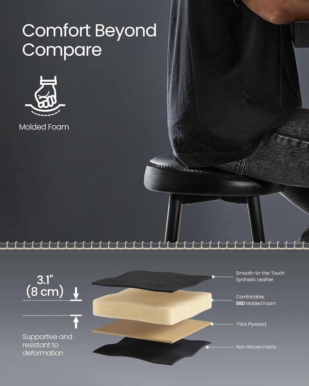 - [Comfort at Every Sit] Glide your hand over the smooth cover, then ease into the supportive luxury of the 3.1" thick, 58D molded foam. These bar stools provide a comfortable seating experience that endures, standing the test of time