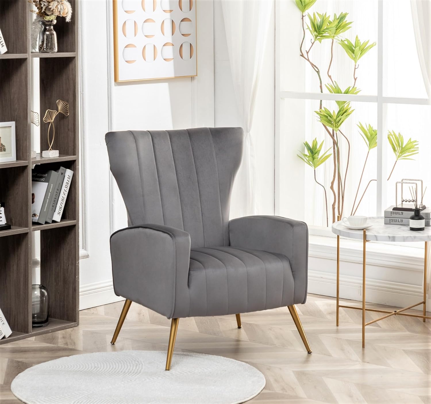 Container Furniture Direct Modern Velvet Accent Chair, Channel Tufted Bedroom, Office or Living Room Furniture with Elegant Metal Legs, 26" Wide Armchair, Grey
