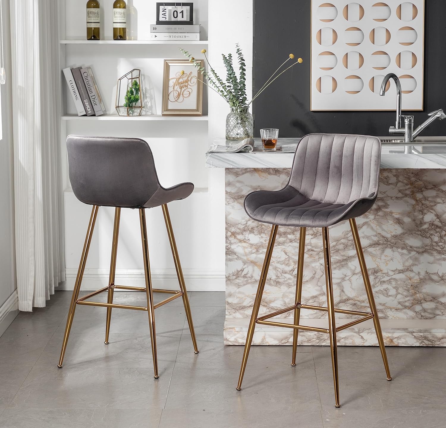 Sidanli Gold Bar Stools Set of 2, 29” Velvet Barstools, Kitchen Chairs for Counter Height with Back and Footrest, Gray