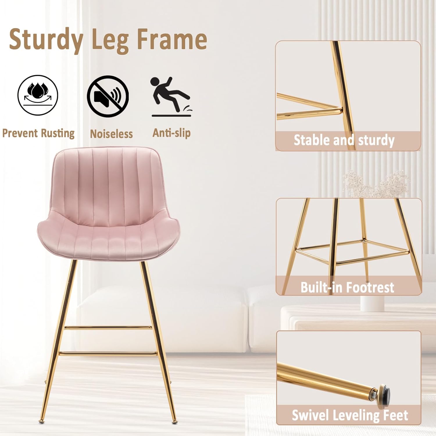 - Each pink and gold bar stool comes with adjustable footrests, providing optimal comfort for counter heights of 32-38 inches. The anti-slip and noise-proof features ensure stability and protect your floors from scratches
