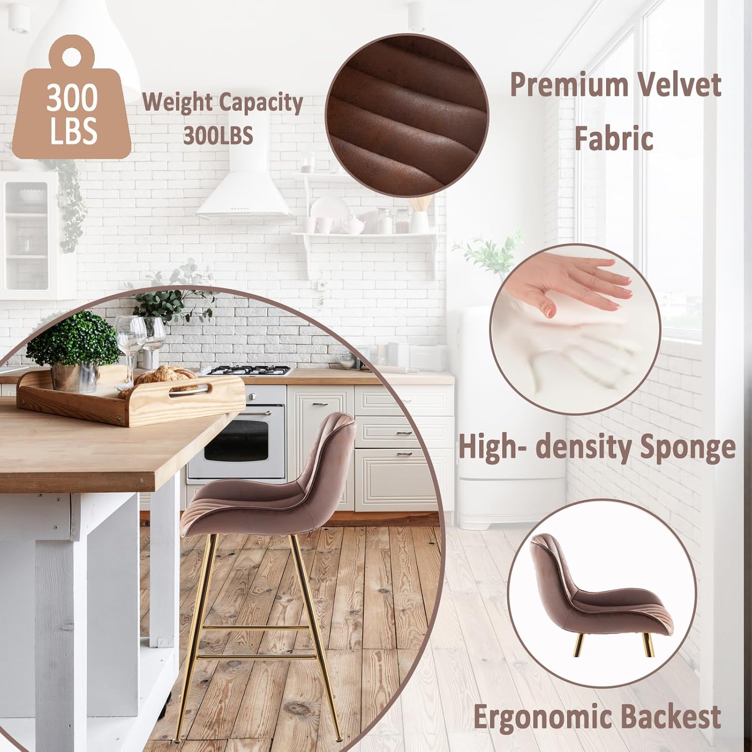 - These brown and gold bar stools feature plush brown velvet cushions and elegant gold-plated frames, adding a touch of modern sophistication to any space. Perfect as island chairs set of 2, kitchen bar stools, gold counter height bar stools