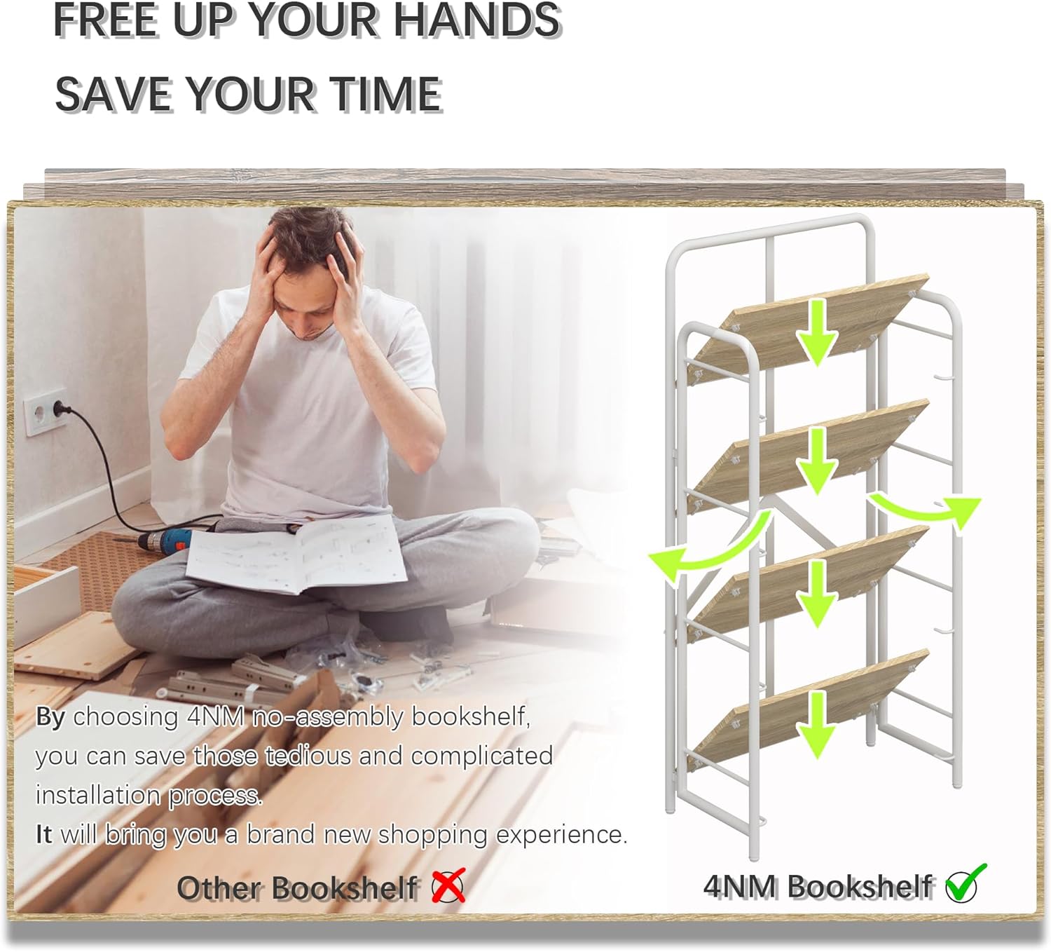 4NM No Assembly Folding Bookshelf 4 Tiers Vintage Industrial White Book Shelf Metal Foldable Storage Bookcase and Bookshelves for Living Room,Bedroom and Kitchen - Natural