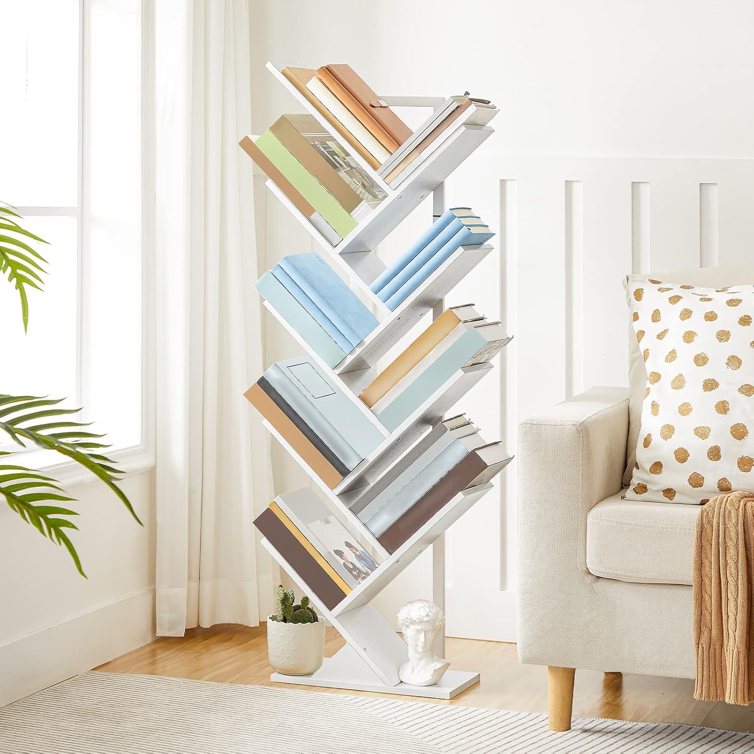 HOOBRO Tree Bookshelf, 9-Tier Bookcase Wooden Shelves, Floor Standing Storage Rack, for Display of CDs, Books in Living Room, Home Office, Wood Storage Rack for Bedroom, White WT08SJ01G1