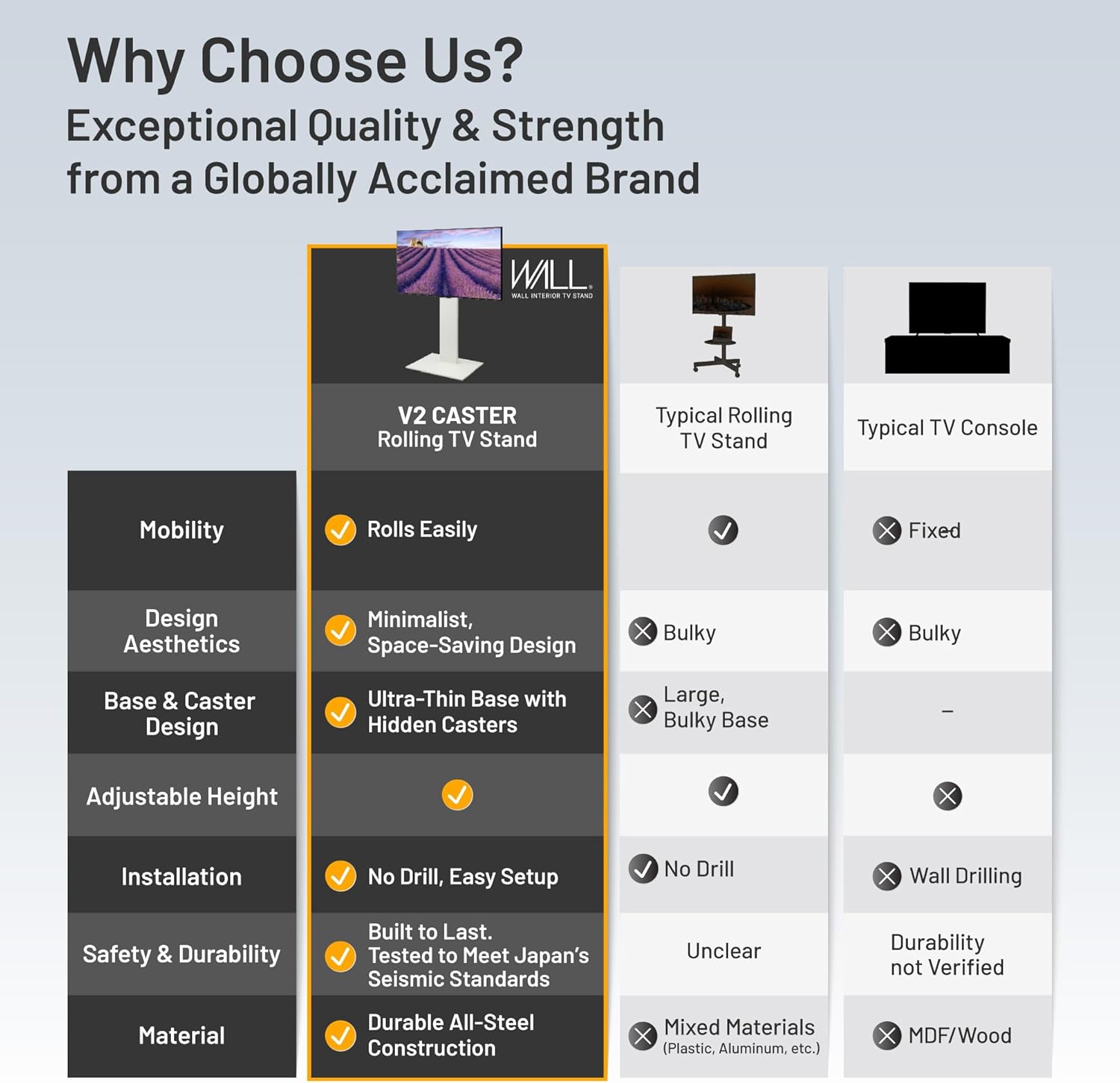 - 【SLEEK & MOVABLE】This modern, low-profile portable television stand on wheels is ultra slim and stylish. With built-in cable management, cords and cables pass through the base and are concealed by the sliding front panel. A back panel cover is available for purchase separately. Unlike the original V2, the mobile V2 CASTER model can be angled in a corner, in front of a window, or stand freely in the center of a living room, bedroom, etc.