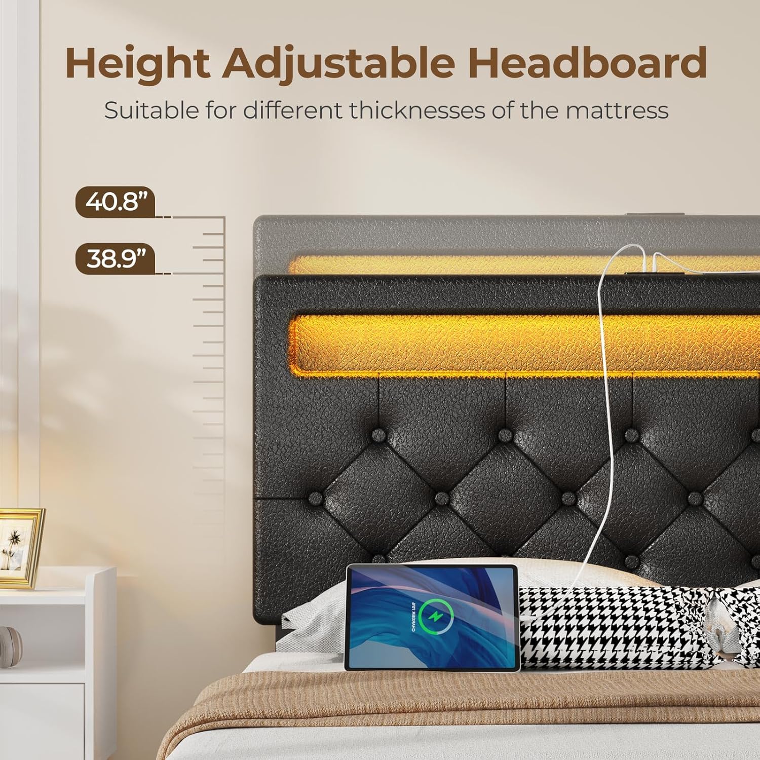 Rolanstar Queen Bed Frame with 4 Storage Drawers and Charging Station, Queen Bed with Led Lights, 2 USB & 1 Type C, Adjustable Headboard 38.9/40.8 Inches, No Box Spring Needed, Black