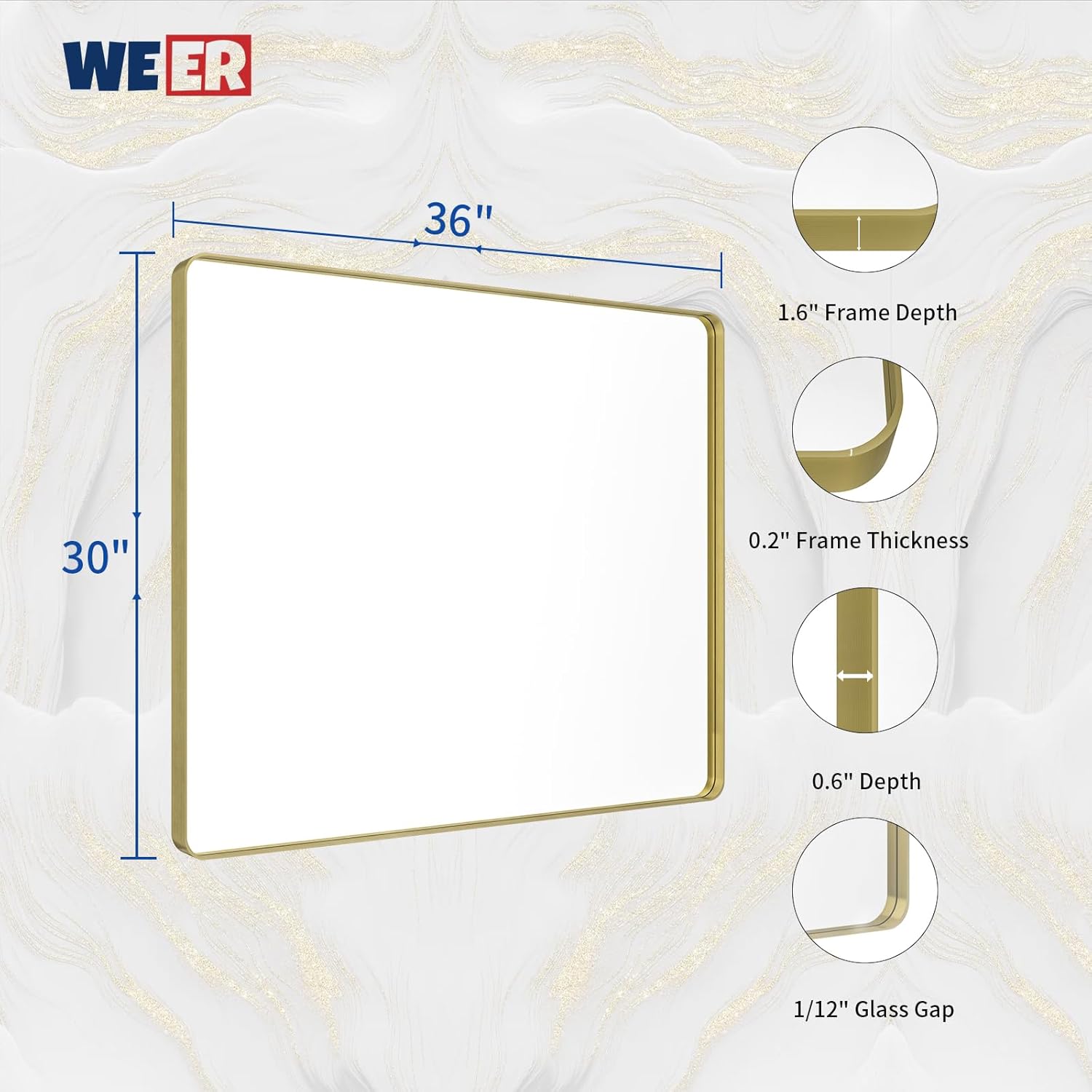 WEER Gold Bathroom Mirror, 36X30 Inch Brushed Gold Metal Frame Mirror, Rounded Rectangle Gold Bathroom Vanity Mirror for Wall, Tempered Glass, Anti-Rust, Hangs Horizontally or Vertically