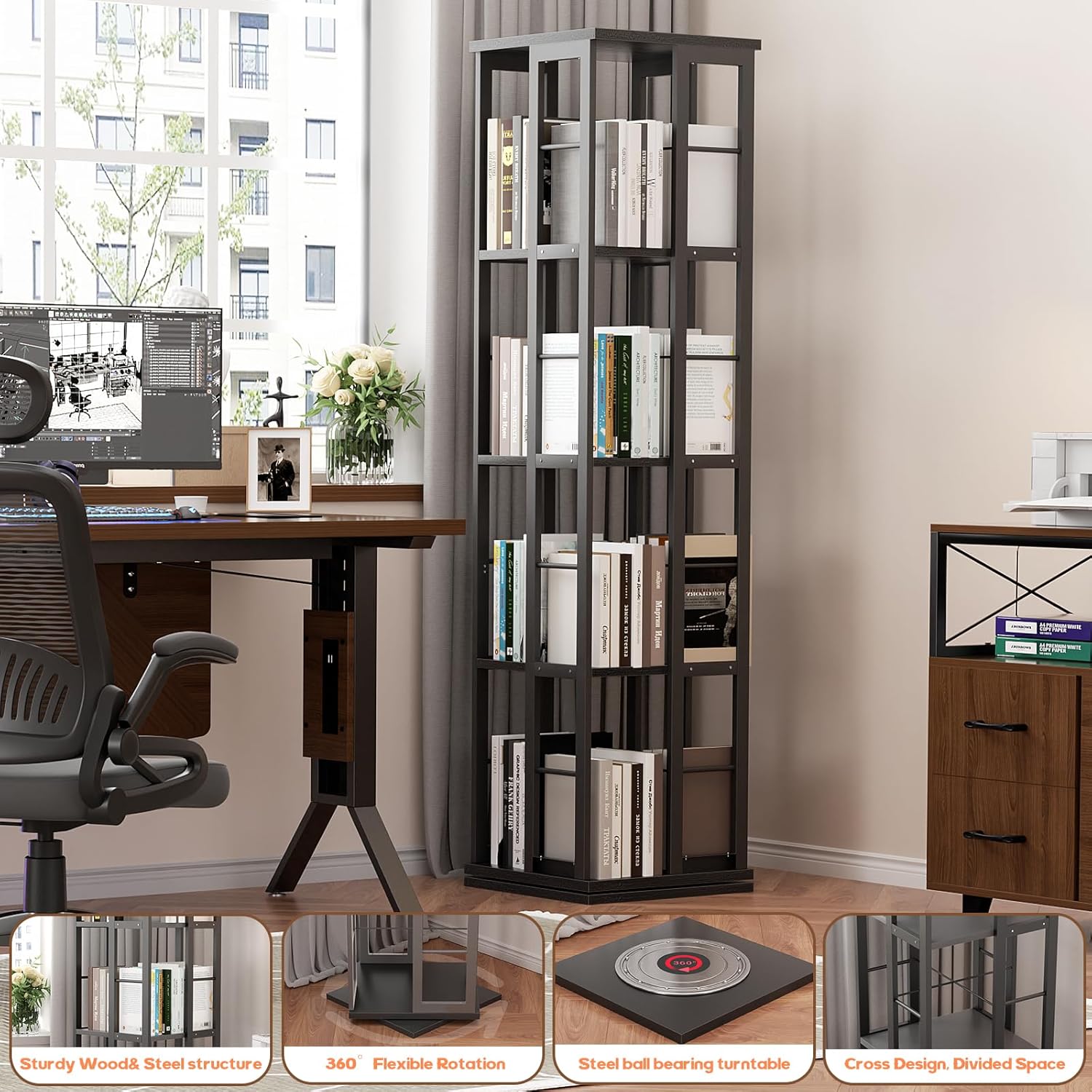 Aheaplus Rotating Bookshelf, 360 Display Wood Spinning Bookshelf, Floor Standing Bookcase Narrow Shelf Revolving Organizer Storage Rack for Small Space, Bedroom, Study Room, Black
