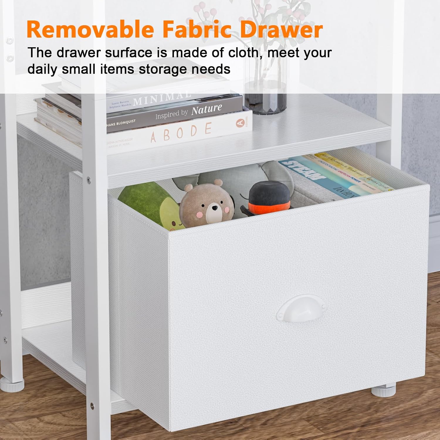 - [Shelf with Removable Fabric Drawer]: This slim white bookcase with a drawer, and the surface is made of cloth, which is light and soft. This design adds security, so it is suitable for use in the nursery matches 2 to 4 tier shelves. Drawer size is 13.7"W x 10.2" D x 10.2"H, same as a small storage box, can be placed anywhere, closet for storage as you like!