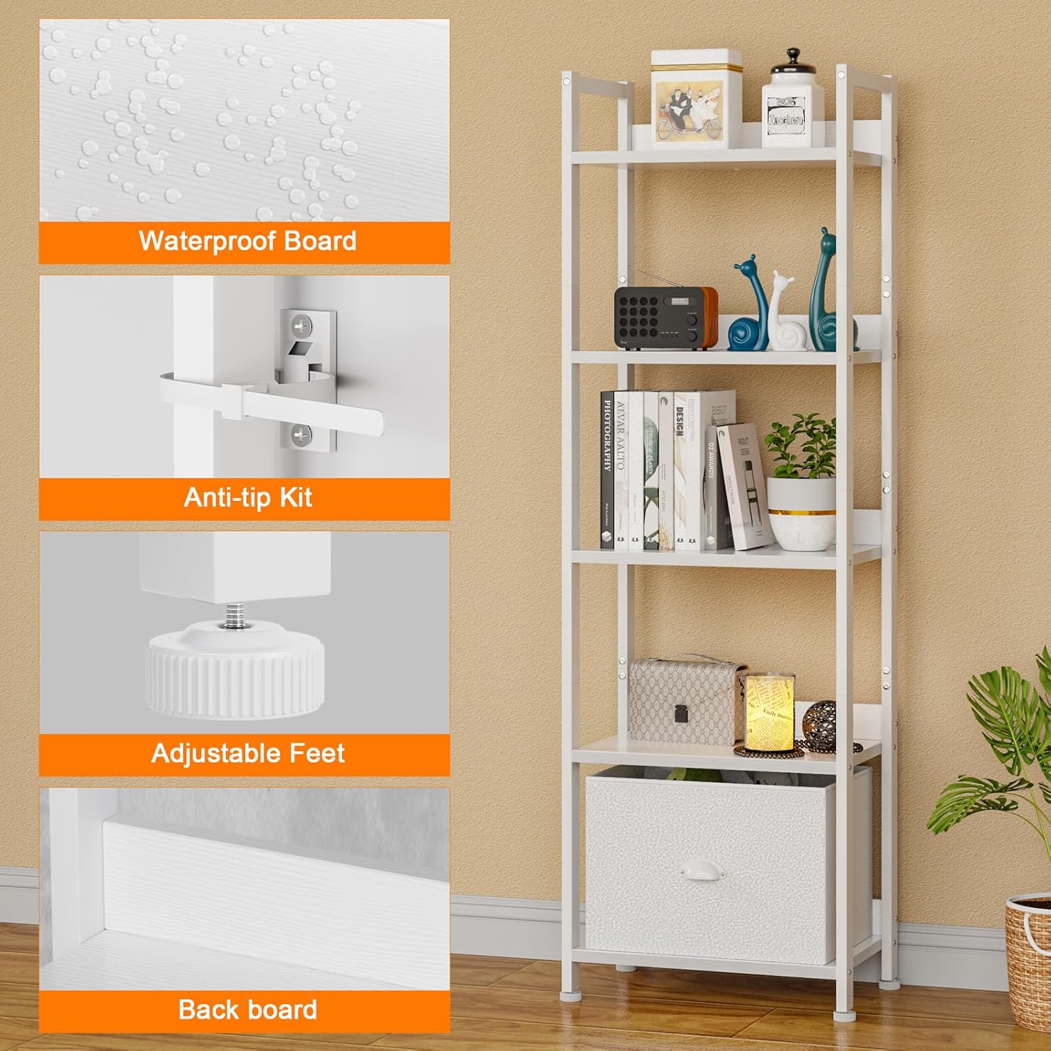 - [Space Saving]: This skinny bookshelf has 5 shelves. Its compact and lightweight design means that it takes up a small floor space. You can use this thin bookshelf to put your favorite books, crafts, photo albums, potted plants, etc. Perfect to store or display your necessities and decorations.