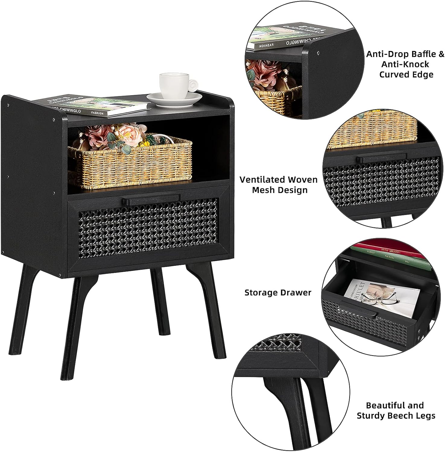 Lerliuo Rattan Nightstands Set of 2, Boho Side Table with Drawer Open Shelf, Cane Accent Bedside End Table with Solid Wood Legs for Bedroom, Dorm and Small Spaces (Black)