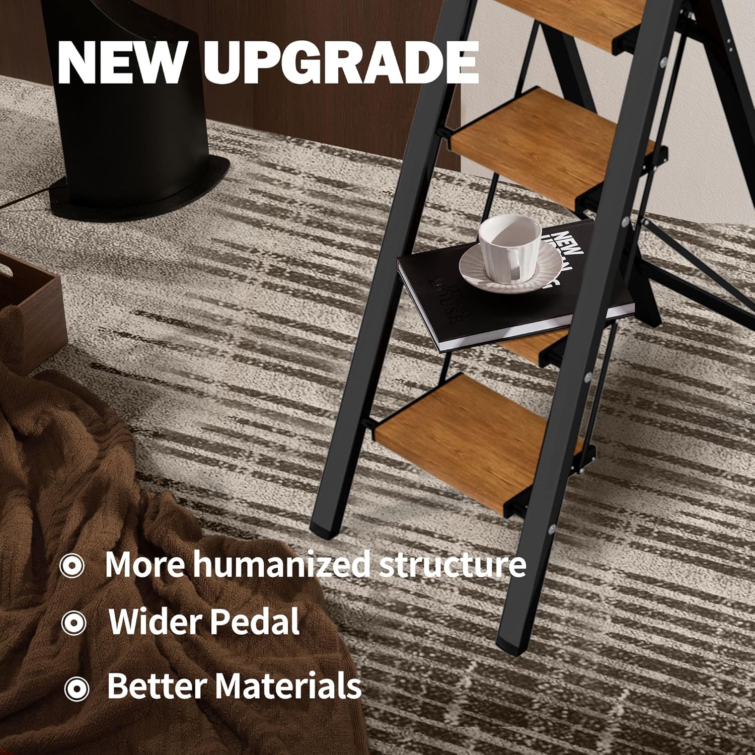 4 Step Ladder,Lightweight Folding Step Stool with Aluminum Wide Pedal& Convenient Handgrip,330lbs Capacity Steel Ladder for Household and Office(Black &Woodgrain)