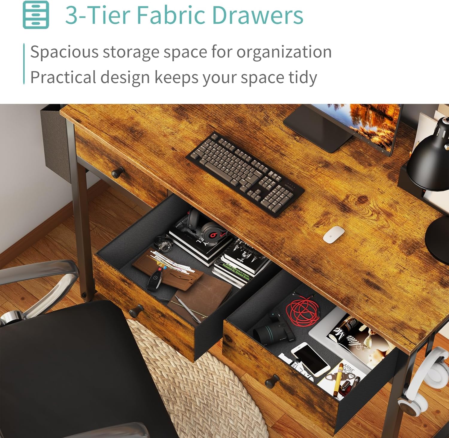 - Vintage Style Design: Computer desk with 3-tier open fabric drawers with wooden front for storage, providing plenty of room for under-desk storage and organization. This splice board desk is made of thick P2 particle wood board with scratch-resistant, anti-collision and waterproof, protect home office desk surface from daily wear and tear.