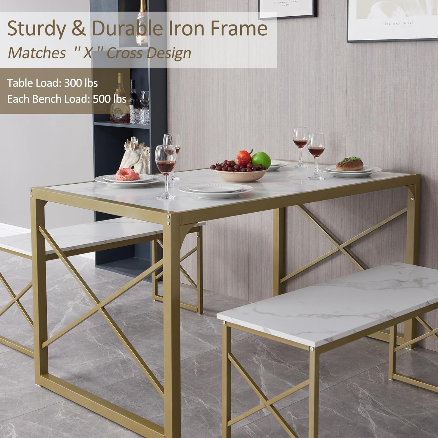 VECELO Kitchen Table with 2 Benches for 4-6,Wood Dining Room Dinette Sets with Metal Frame for Breakfast Nook and Small Space