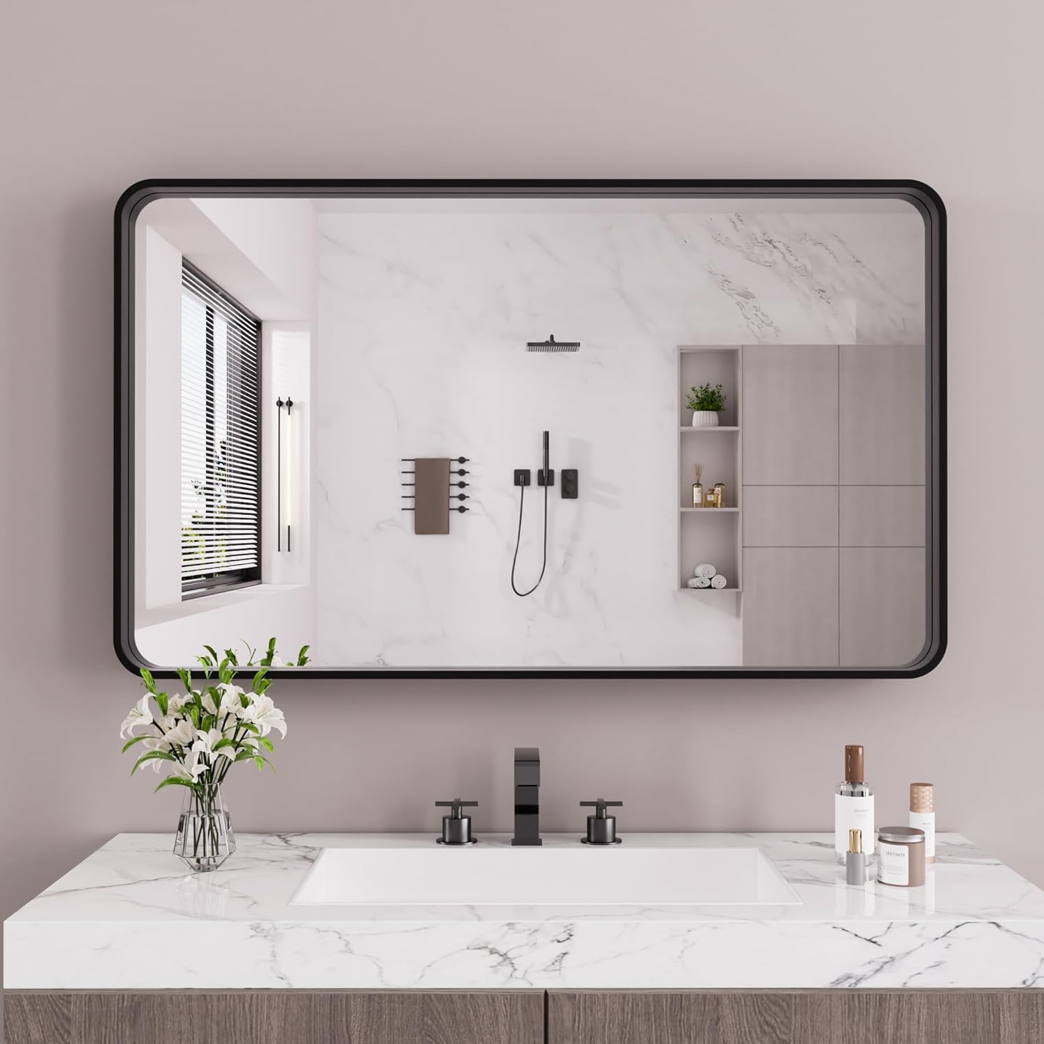 Black Bathroom Mirror 55X30 Inch, Black Metal Framed Mirror for Wall, Rounded Rectangle Matte Bathroom Vanity Mirror with Tempered Glass, Anti-Rust, Horizontal/Vertical