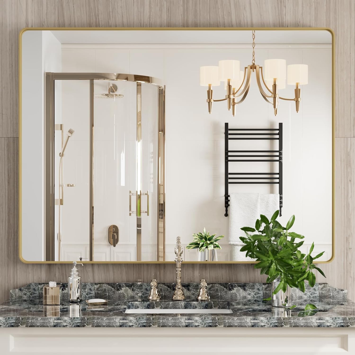 Gold Bathroom Mirror, 48x36 Inch Brushed Gold Metal Frame Mirror for Wall, Rounded Rectangle Bathroom Vanity Mirror, Tempered Glass, Anti-Rust, Horizontal/Vertical
