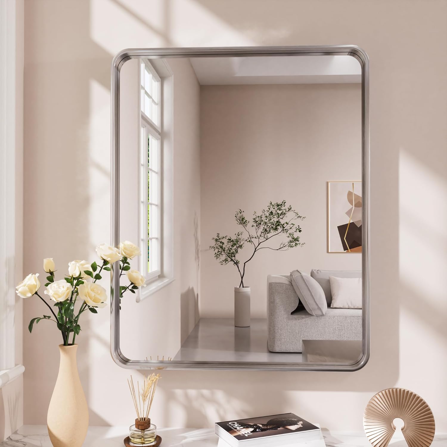 Brushed Nickel Bathroom Mirror 20x30 Inch, Brushed Silver Metal Frame Mirror Wall Mounted, Rounded Rectangle Bathroom Vanity Mirror, Tempered Glass, Anti-Rust, Horizontal/Vertical