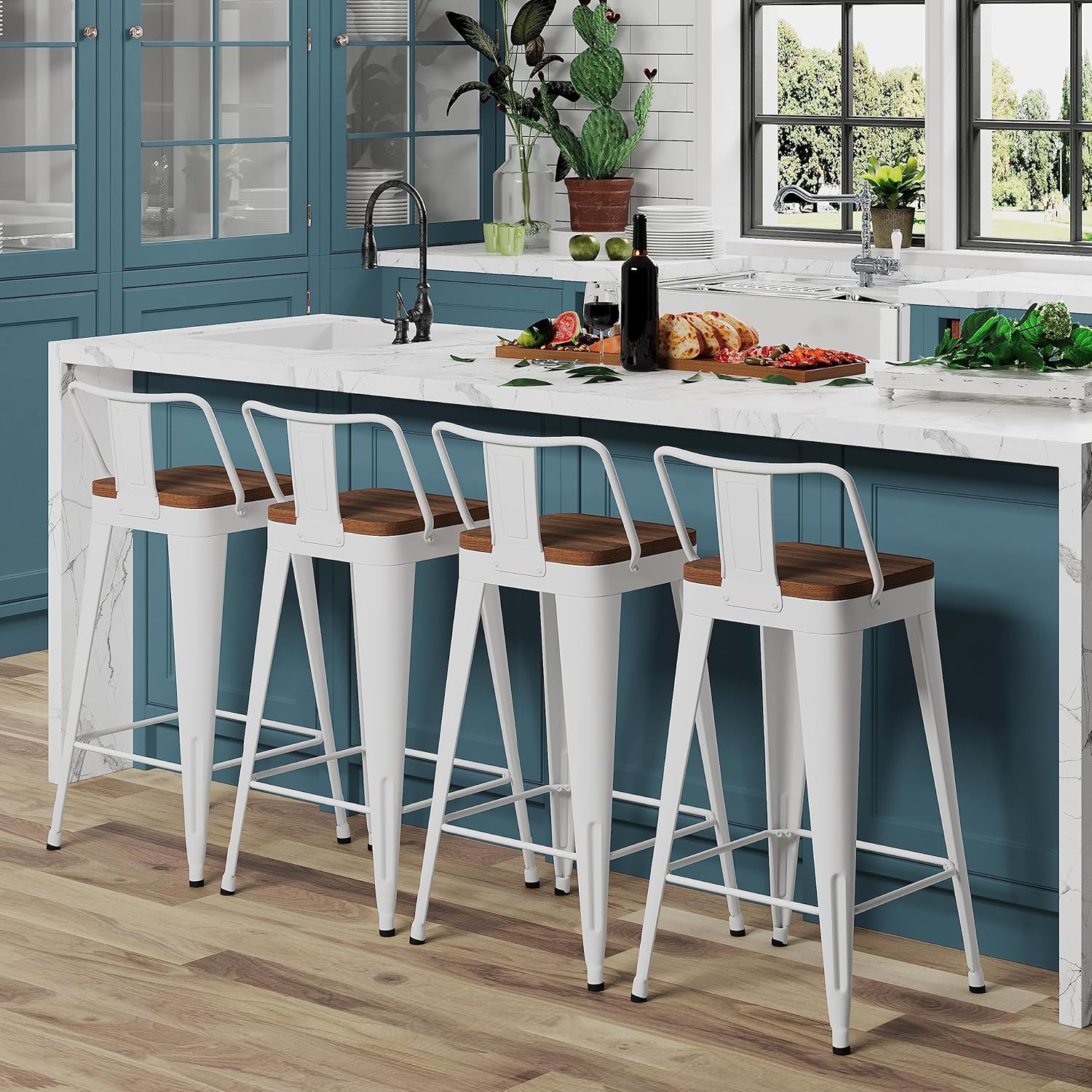 WENTMENT Metal Bar Stools Set of 4 Counter Height Stools Barstools with Removable Back 24" Kitchen Bar Stools with Wooden Seat, White