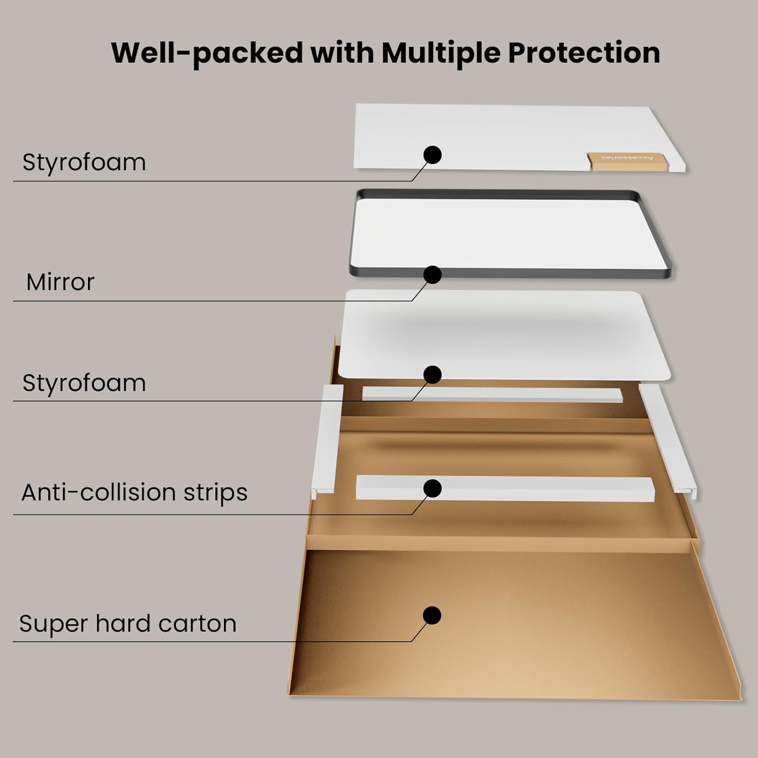 - Secure Packaging: The professional packaging employs custom-designed thick foam encased in a durable carton box, has passed stringent drop and impact tests, and ensures you will receive a perfect mirror