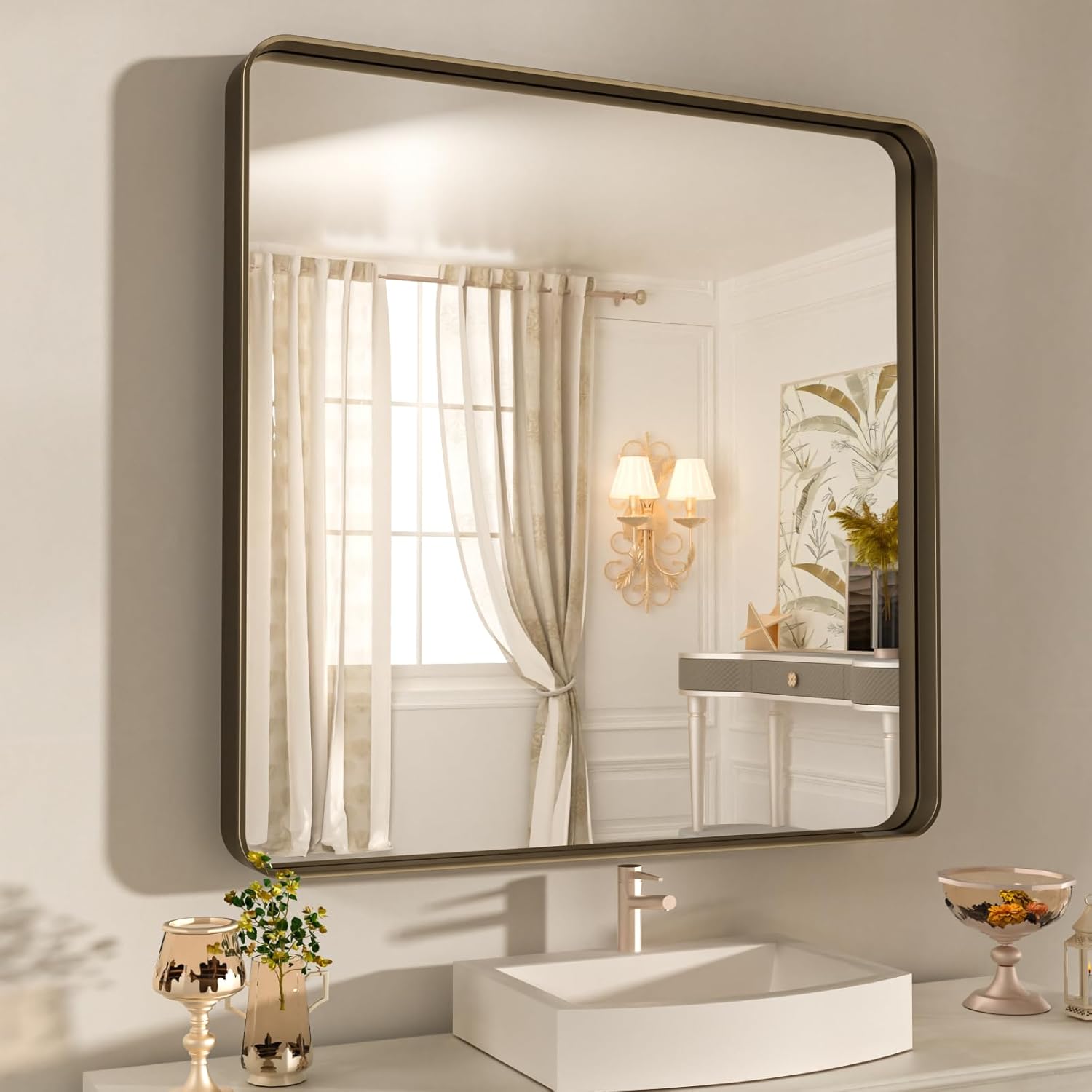 - 【Clear Reflection & NO Distortion】: The bronze framed bathroom mirrors is designed with HD float glass to ensure 1:1 restoration of real image, delivers a clear reflection with no distortion;