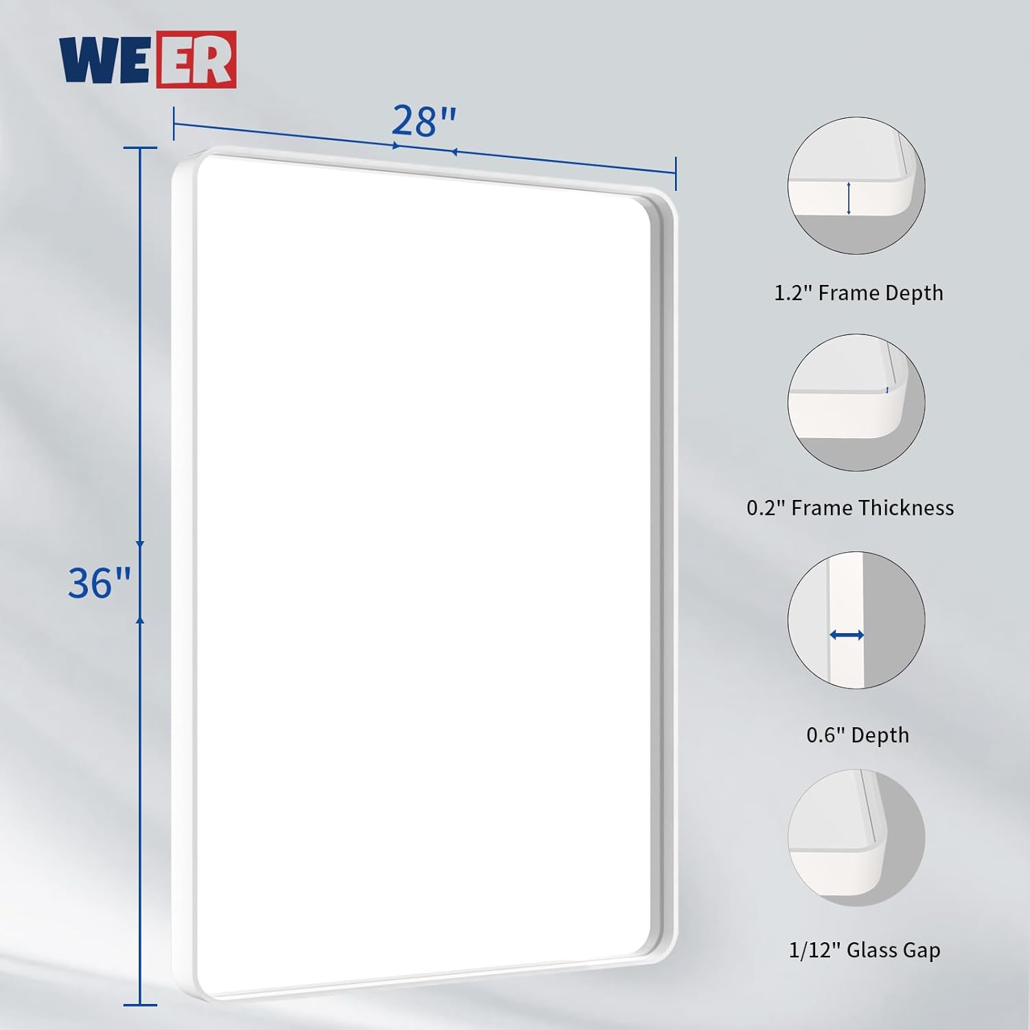 - 【Shatterproof Tempered Glass】: All WEER white wall mirror bathroom is built with 4MM tempered glass which is shatter-proof, burst-proof and more safer to use. The shatterproof film is the important layer that will not splash into pieces when it's broken;