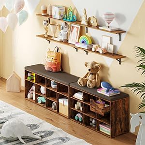 - 【Adjustable Shelves for Multiple Needs】3 middle compartments are fixed size for sneakers, high heels and sandals. Shelves on both sides of the entryway bench are adjustable to 3 heights for storing slippers, boots or baskets. A perfect storage solution to store blankets, books and toys