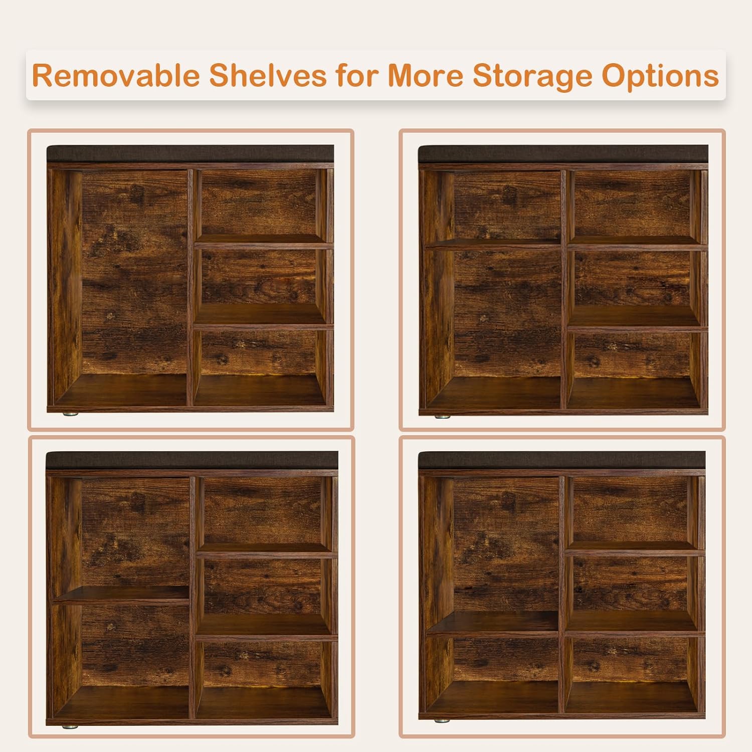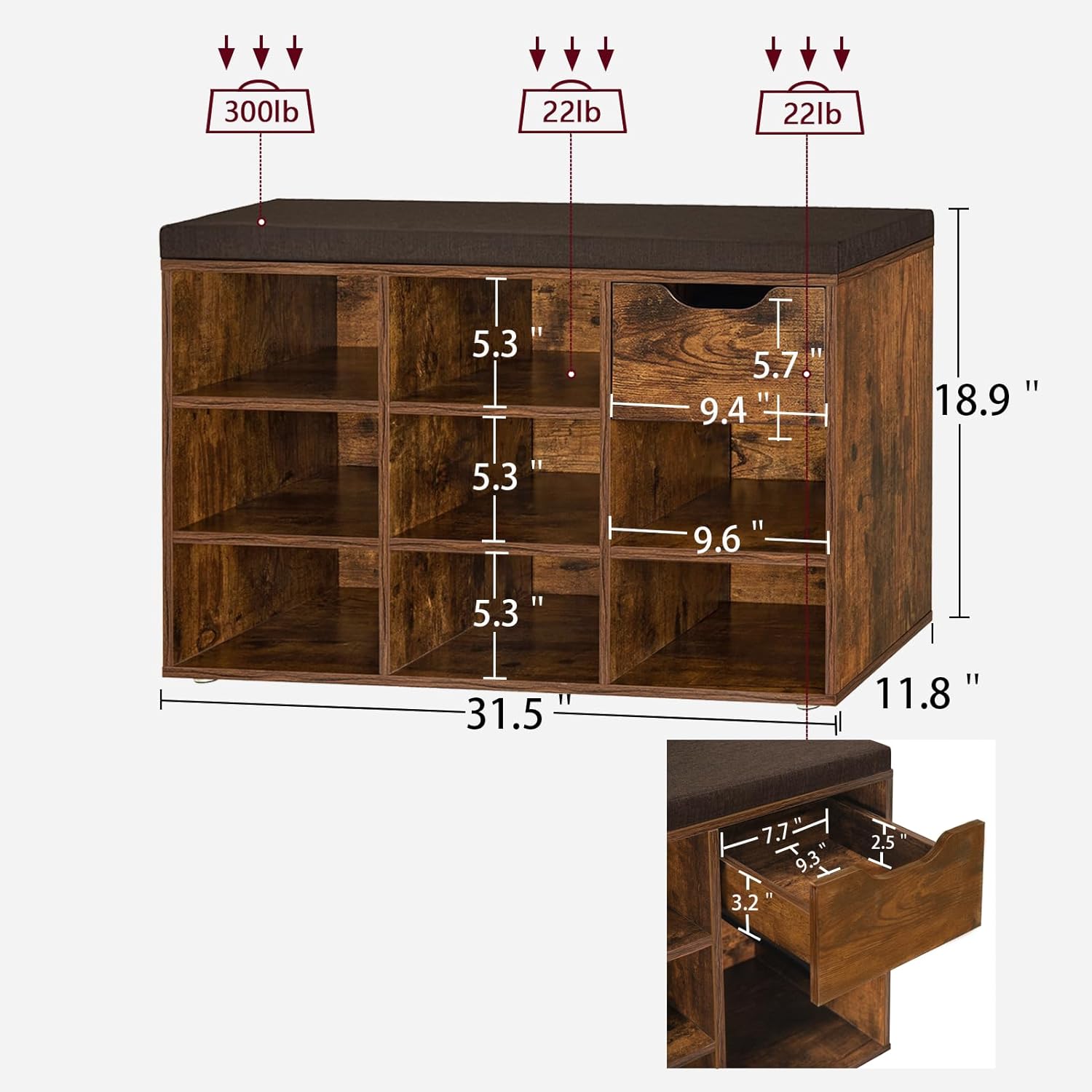 DINZI LVJ Shoe Bench, Entryway Storage Bench with Drawer and 8 Cubbies, Cubby Shoe Rack with Adjustable Shelves, Shoe Organizer Cabinet for Living Room, Bedroom, Mudroom and Garage, Rustic Brown