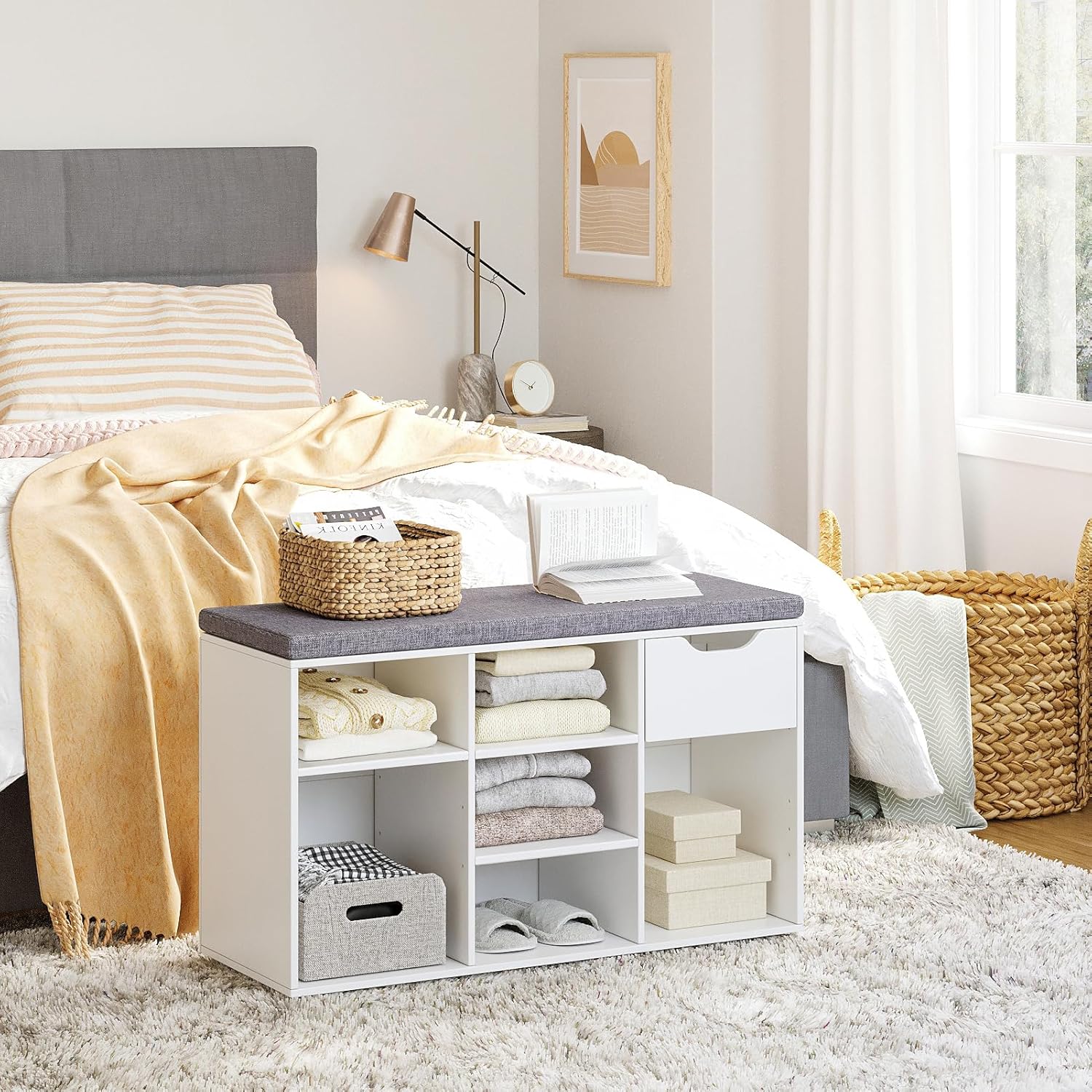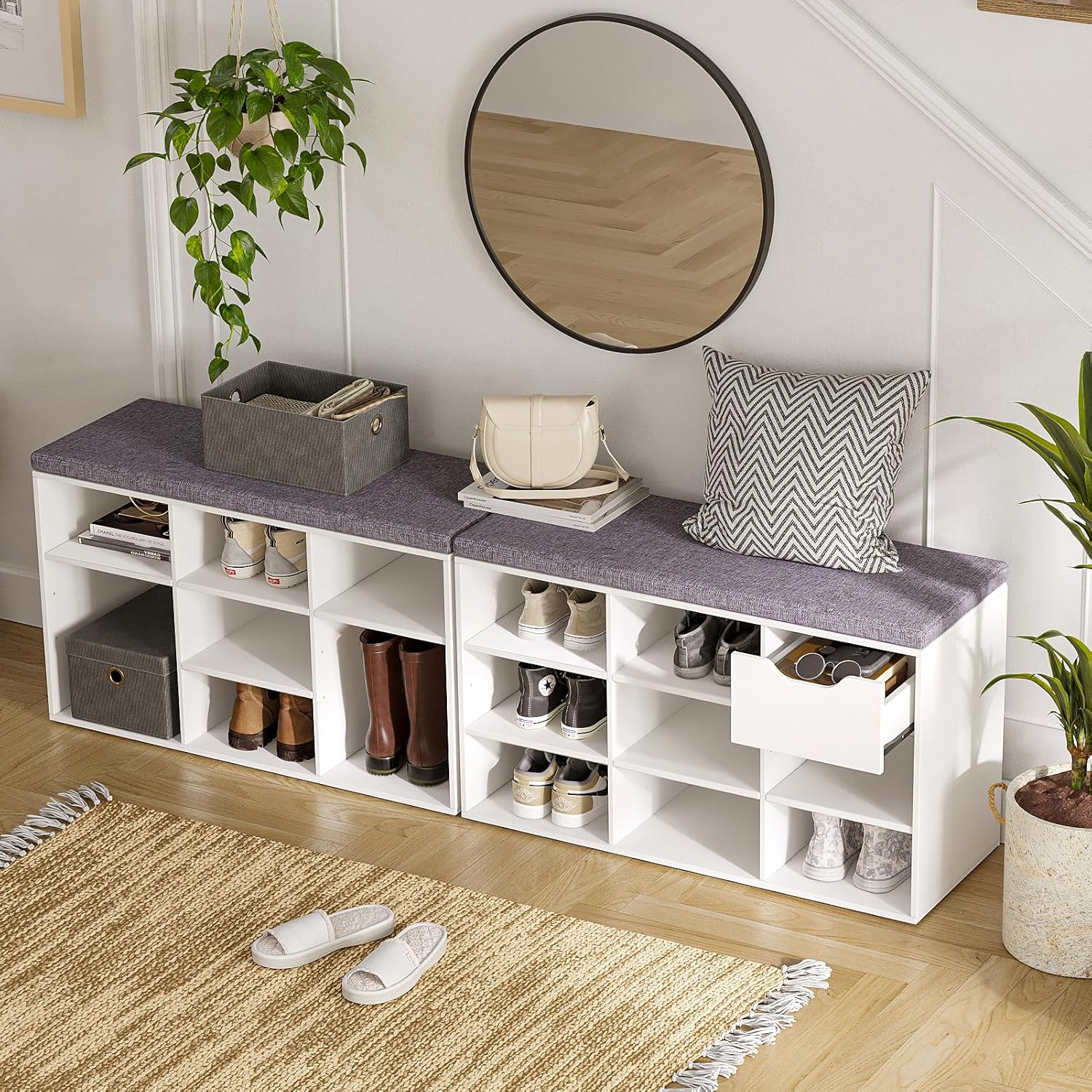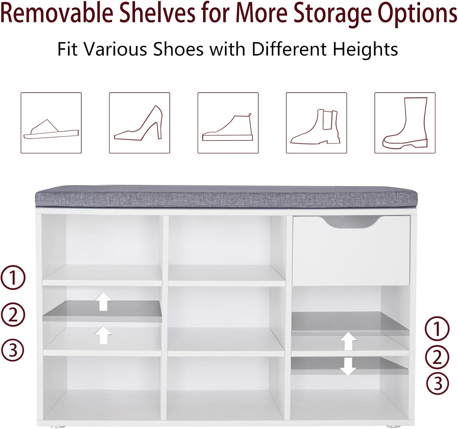 - 【Multi-purpose Shoe Bench】Hide your keys, wallet, gloves, sunglasses, flashlight and dog leash in the small drawer. Everything is easy to reach before going out. 8 cubbies are available for 6-8 pairs of shoes. To be entryway bench, window seat and bed-end stool for entry porch, front door, living room, bedroom