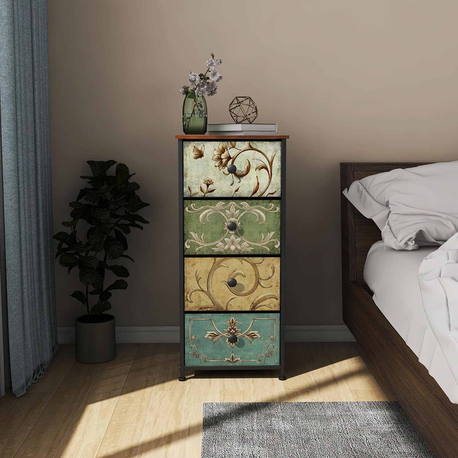 Tohomeor Small Dresser for Bedroom with Retro Flower Narrow Drawers Slim Chest of Drawers Skinny Nightstand Sofa End Table for Living Room Entryway Closet Storage (Multi, 4 Drawers)