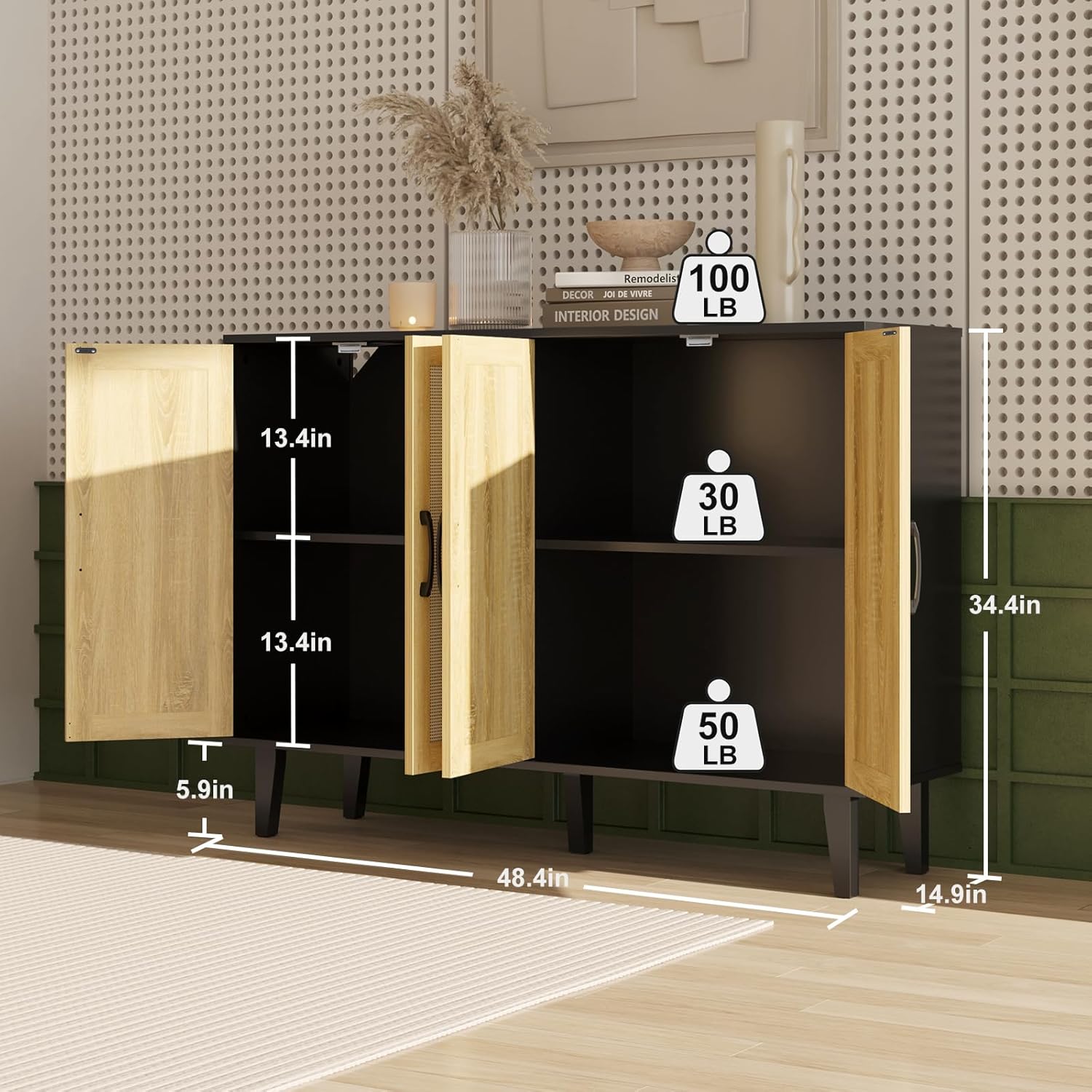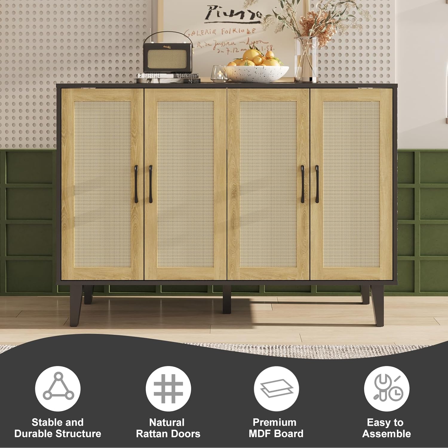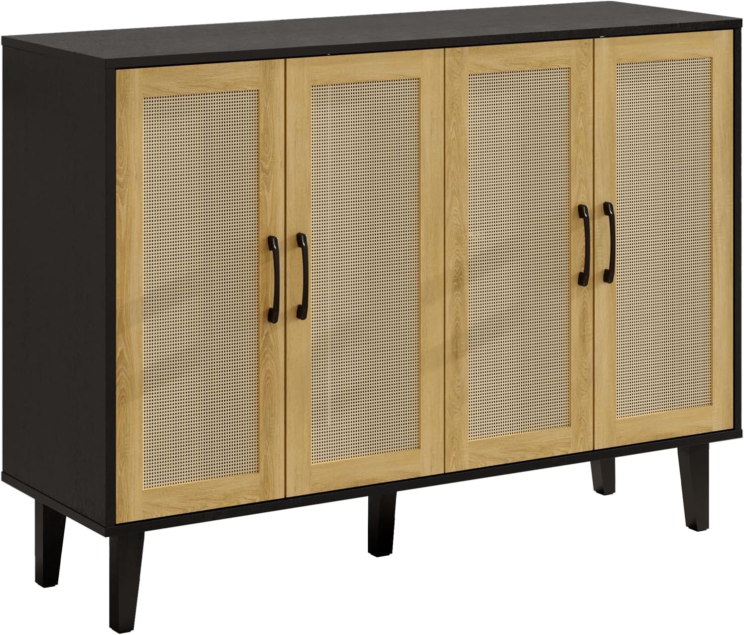 Storage Cabinet with Rattan Trim - 4 Door Sideboard Buffet Cabinet with Storage, Accent Cabinet with Shelves for Bathroom, Coffee Bar, Kitchen, Living Room, Hallway (Black)
