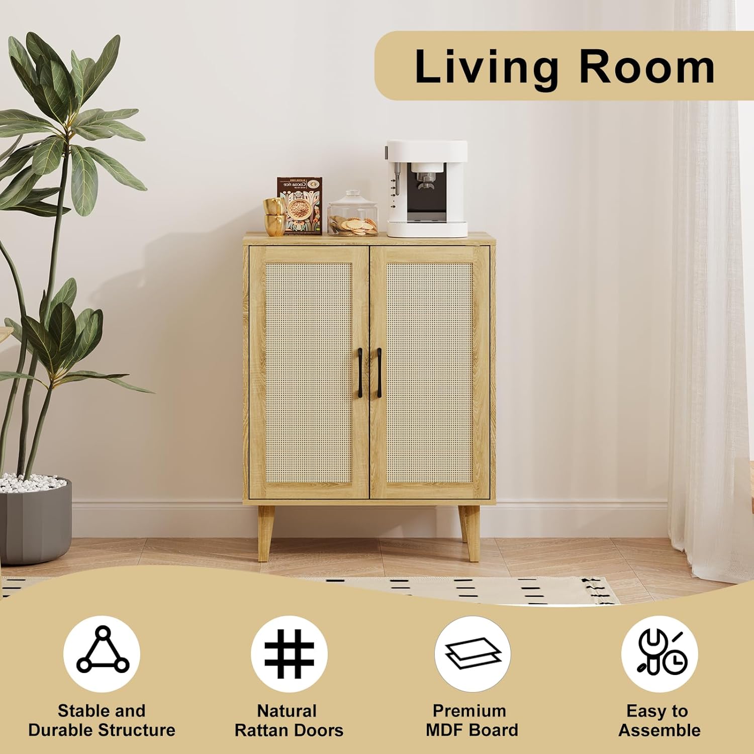 Rattan Decorated Buffet Cabinet - 2 Doors Simple Style Storage Cabinet, Shoe Cabinet with Adjustable Shelves, Sideboard for Kitchen, Living Room, Hallway, Entryway (Natural Wood)