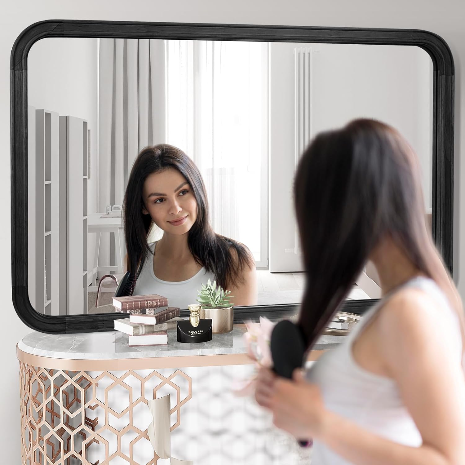 - Wood Rounded Corner Frame Design: This black Wall Mirrors are handcrafted with care and attention to detail and design, High-Quality solid wood frame, and Mirror Materials to guarantee the sturdiness and consistent aesthetic beauty of the design.